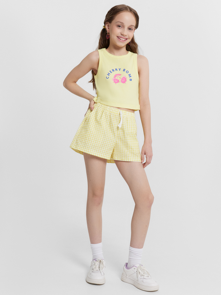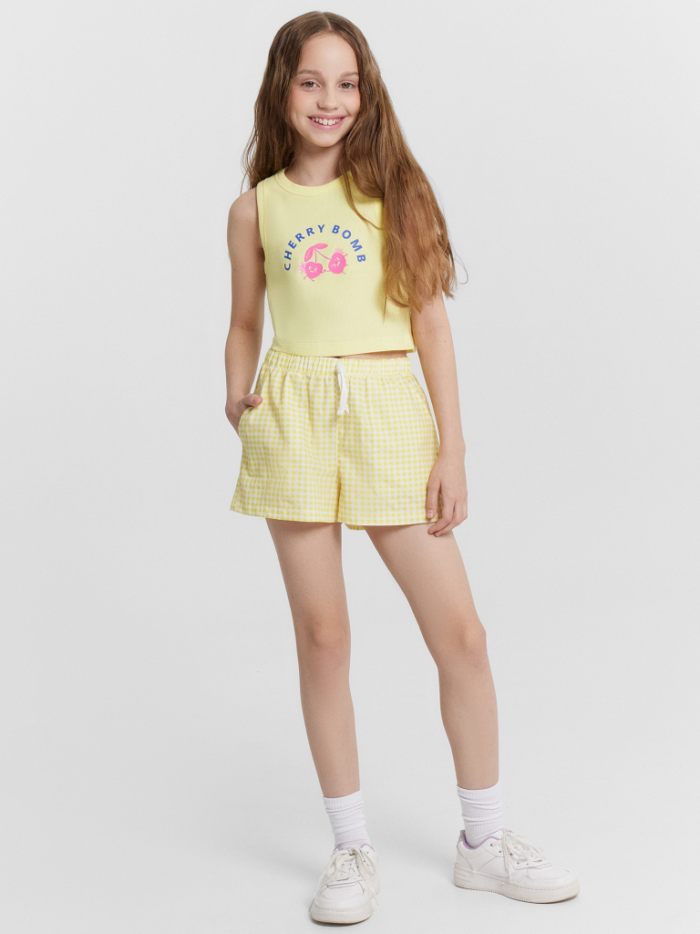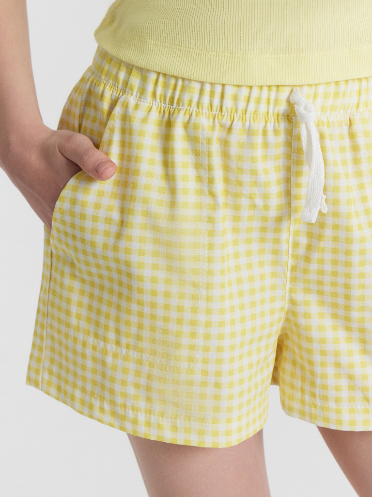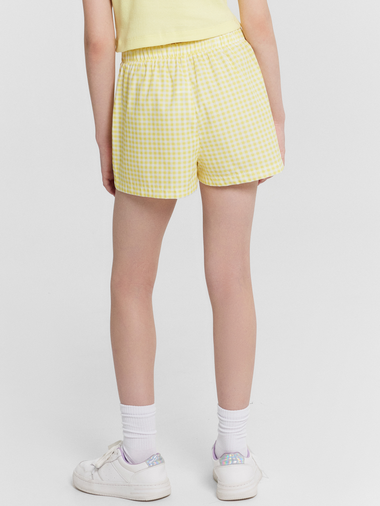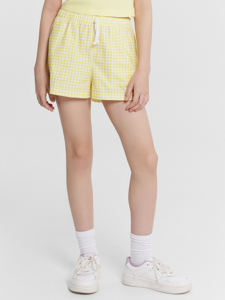 Стильные мини-шорты из текстильного полотна. В поясе – эластичная тесьма, на центральной части пояса – бантик. Есть боковые карманы. Лаконичные и комфортные шорты!