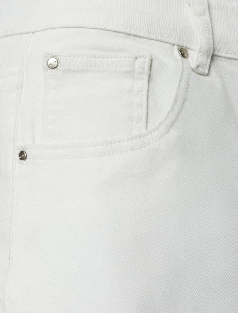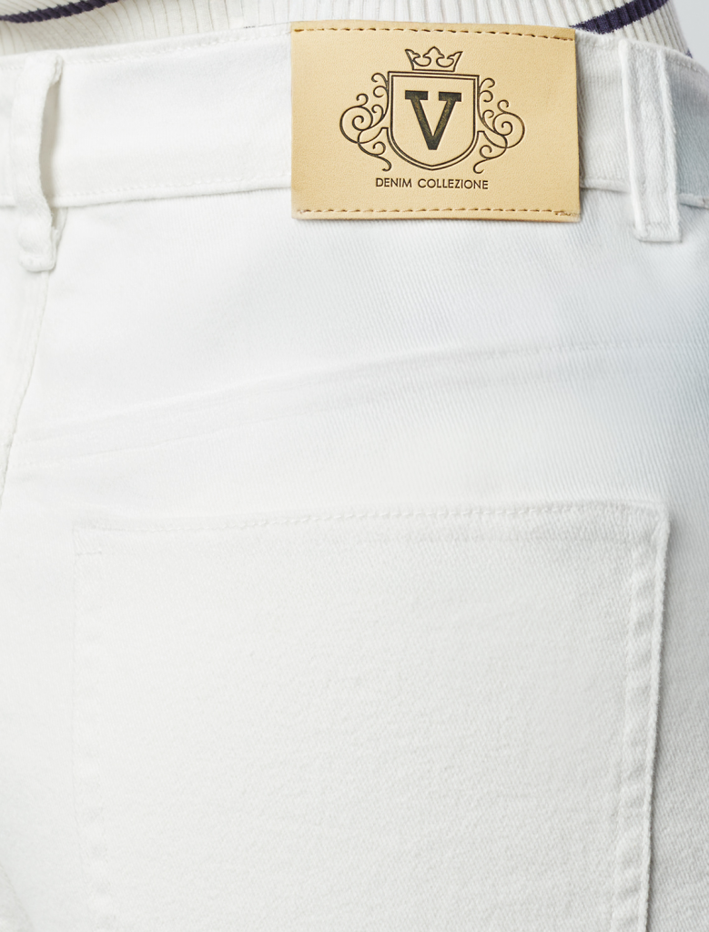 Шорты выполнены из эластичного денима. Модель со свободной посадкой и подворотами дополнена тонкими бежевыми строчками. За счет эластана изделие хорошо тянется и гарантирует комфорт и формоустойчивость. Подходит для любой фигуры. Сзади фирменный брендированный патч.