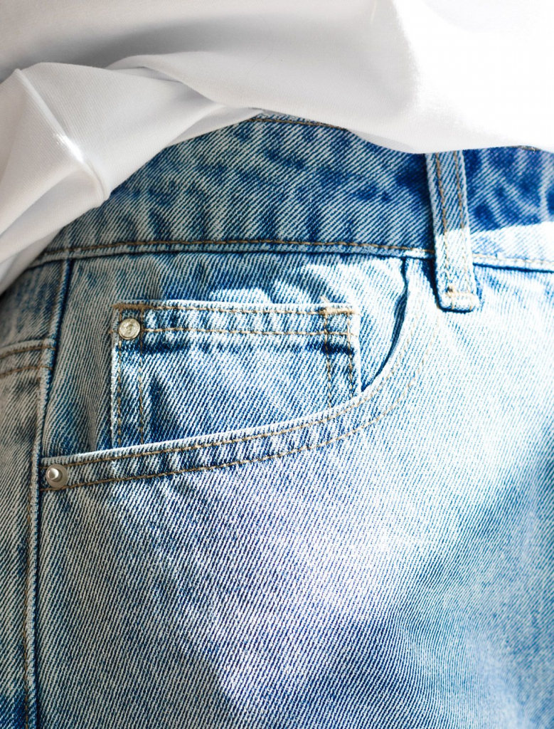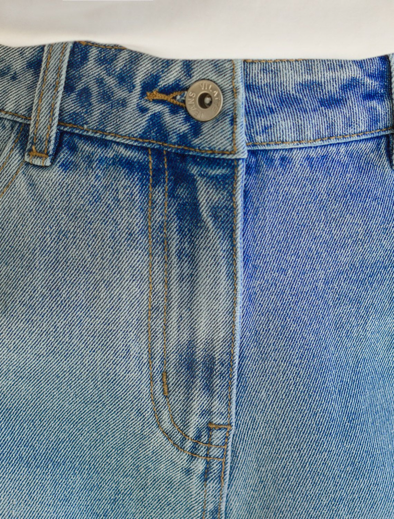 Шорты в голубом оттенке выполнены из эластичного денима. Модель с эффектной стиркой и трендовым ассиметричным рваным краем свободно сидит по фигуре и не сковывает движений. Сзади изделия фирменный брендированный патч.