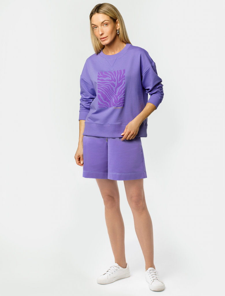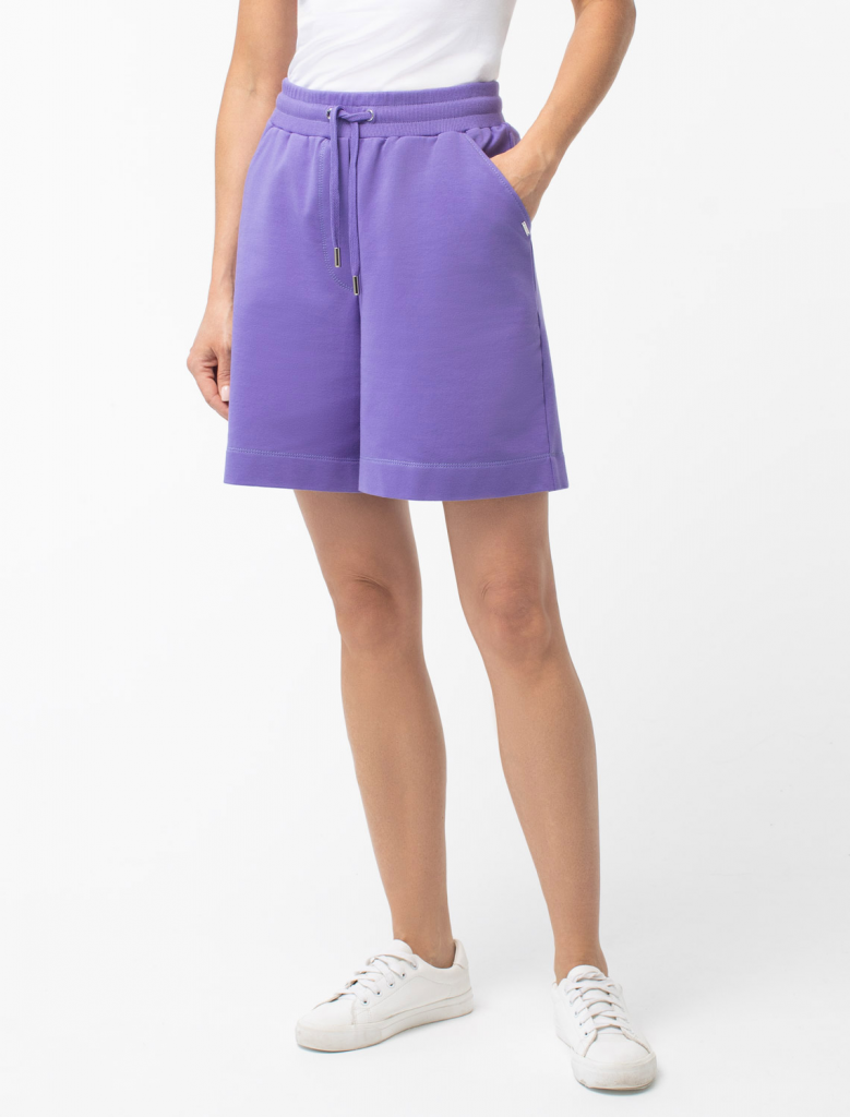 Шорты выполнены из футера двухнитки с эластаном. Модель прямого кроя дополнена боковыми карманами и одним задним карманом. Пояс выполнен из эластичного трикотажа в рубчик. В пояс вставлен плоский хлопковый шнур в тон изделия с серебристыми наконечниками. Изделие дополнено металлическим логотипом бренда. Сочетается в костюме с жакетом D49.078, джемпером D49.079, D49.080 и футболкой D49.081