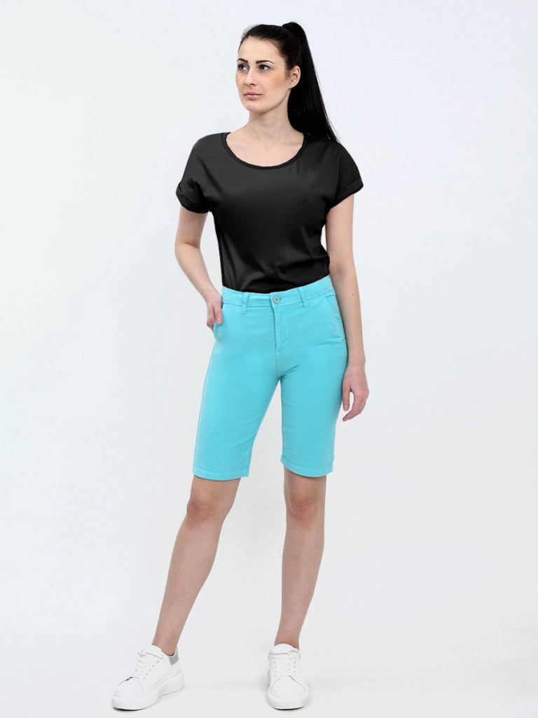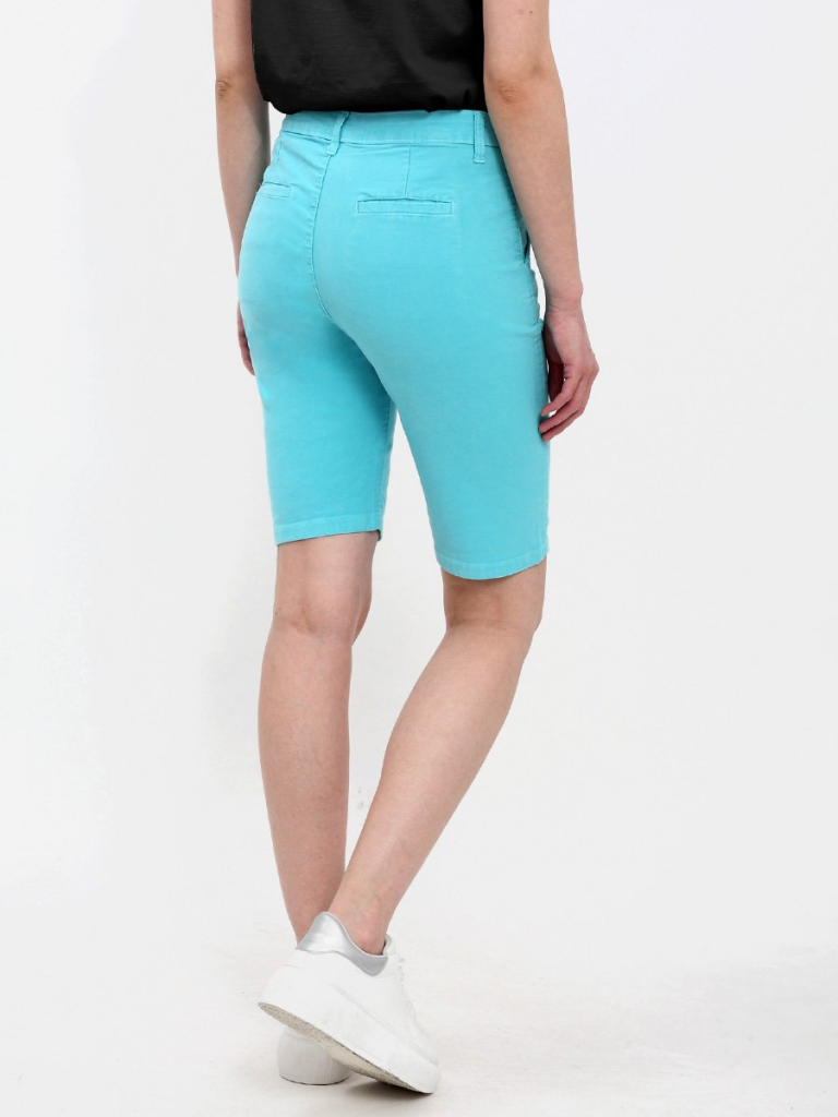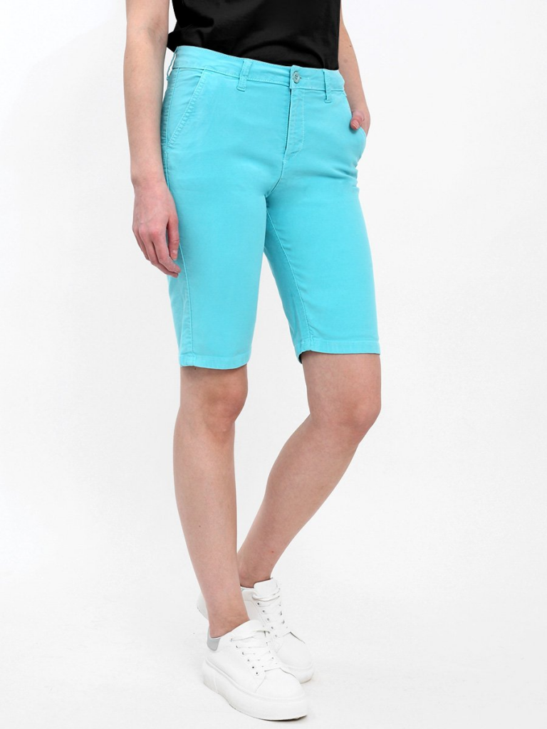 Женские классические шорты Chinos. Посадка Regular fit (полуоблегающие по бедру), заужены к низу. Высокая талия. Застежка на молнии. Сзади прорезные карманы "в листочку". Выполнены из отбеленной эластичной мягкой ткани gabardine stretch. Изделие постирано в готовом виде после пошива. Параметры указаны для размера 28. Длина внутреннего шва для всех размеров - 28, 0 см.