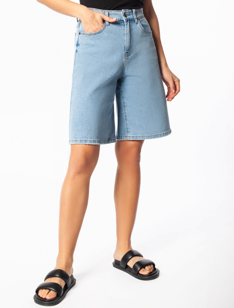 Шорты-бермуды выполнены из эластичного денима с декоративными потертостями. Изделие хорошо тянется и не сковывает движений. Подойдет для образов в любом сезоне. На поясе расположен брендированный патч.