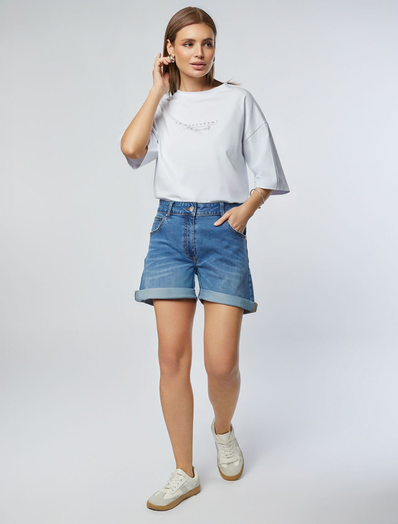 Шорты выполнены из эластичного денима. Модель со свободной посадкой и подворотами дополнена декоративной стиркой и тонкими коричневыми строчками. За счет эластана изделие хорошо тянется и гарантирует комфорт и формоустойчивость. Подходит для любой фигуры. Сзади фирменный брендированный патч.