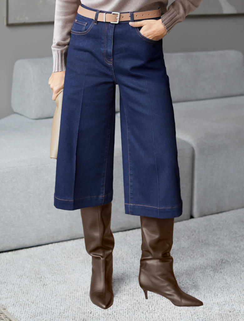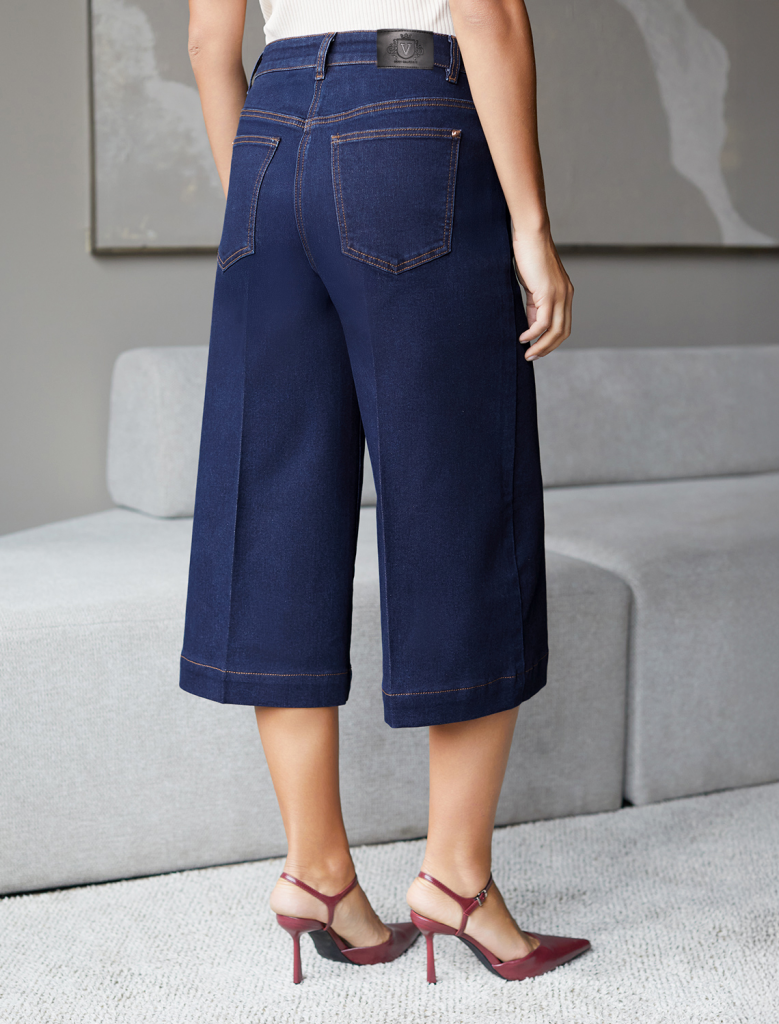 Свободные джинсовые бермуды насыщенного темно-синего цвета из эластичного денима обеспечивают комфорт и стиль в повседневном образе. Длинные классические шорты с пятью карманами выполнены с широким подгибом по низу и со стрелками по всей длине, что эффектно удлиняет ноги и визуально стройнит силуэт. Правильная посадка и классический фасон подходит как для маленьких, так и для больших размеров. Материал эластичен, благодаря чему шорты отлично садятся по фигуре и не сковывают движения, обеспечивает долговечность изделия, сохраняя первоначальный вид даже после многократных стирок и активного использования. Шорты дополнены качественной фуртитурой и брендированным патчем из эко-кожи на поясе.Расклешенные шорты отличаются женственным кроем, такие бермуды легко комбинируются с различными элементами гардероба — от легких футболок до стильных рубашек, свитеров, позволяя создавать разнообразные образы как для повседневной носки, так и для отдыха. Сочетайте такие трендовые бермуды с высокими сапогами для создания клас