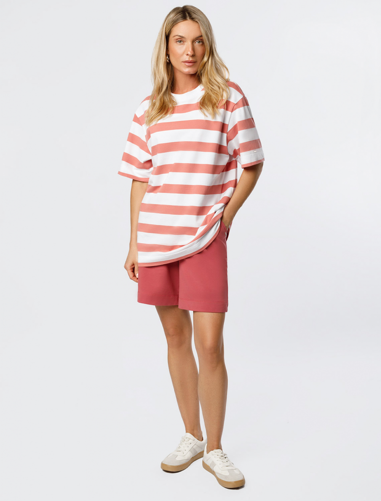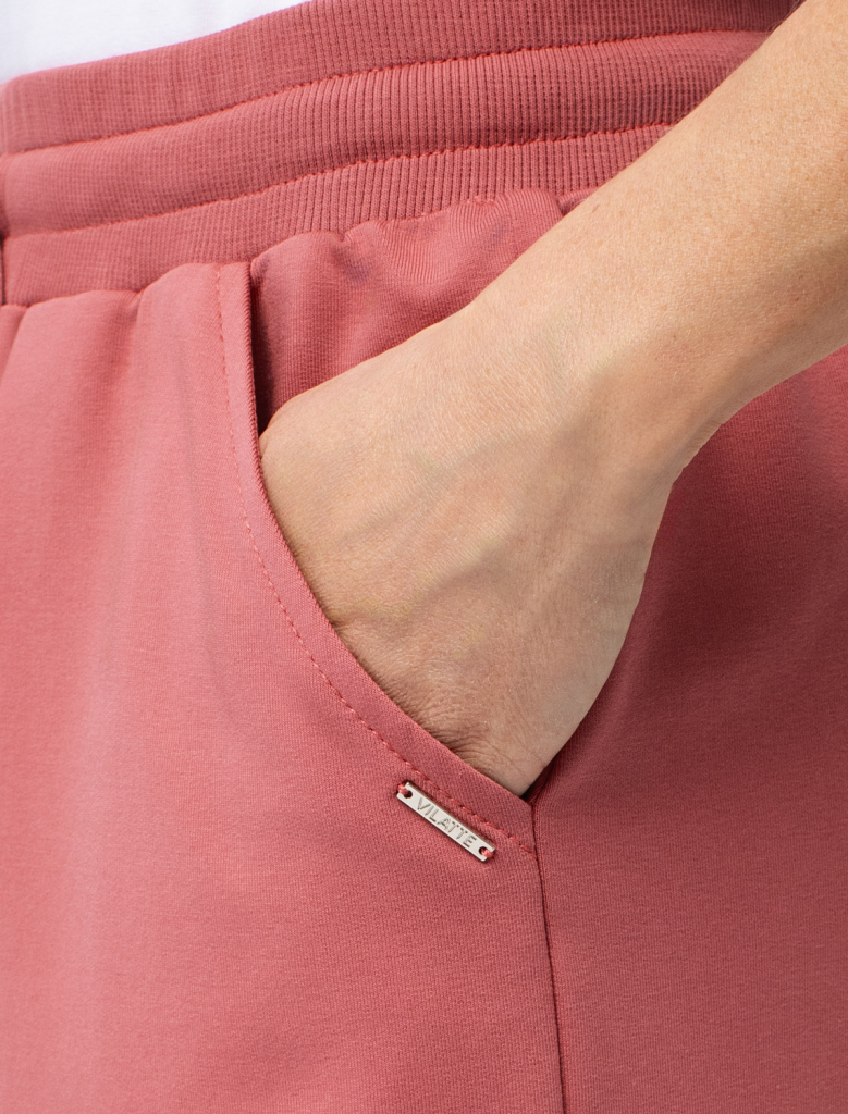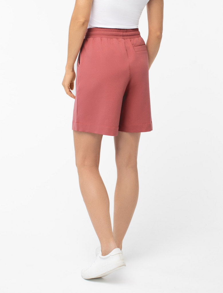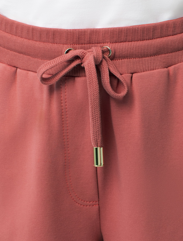Шорты выполнены из футера двухнитки с эластаном. Модель прямого кроя дополнена боковыми карманами и одним задним карманом. Пояс выполнен из эластичного трикотажа в рубчик. В пояс вставлен плоский хлопковый шнур в тон изделия с золотистыми наконечниками. Изделие дополнено металлическим логотипом бренда. Сочетается в костюме с жакетом D49.078, джемпером D49.079, D49.080 и футболкой D49.081