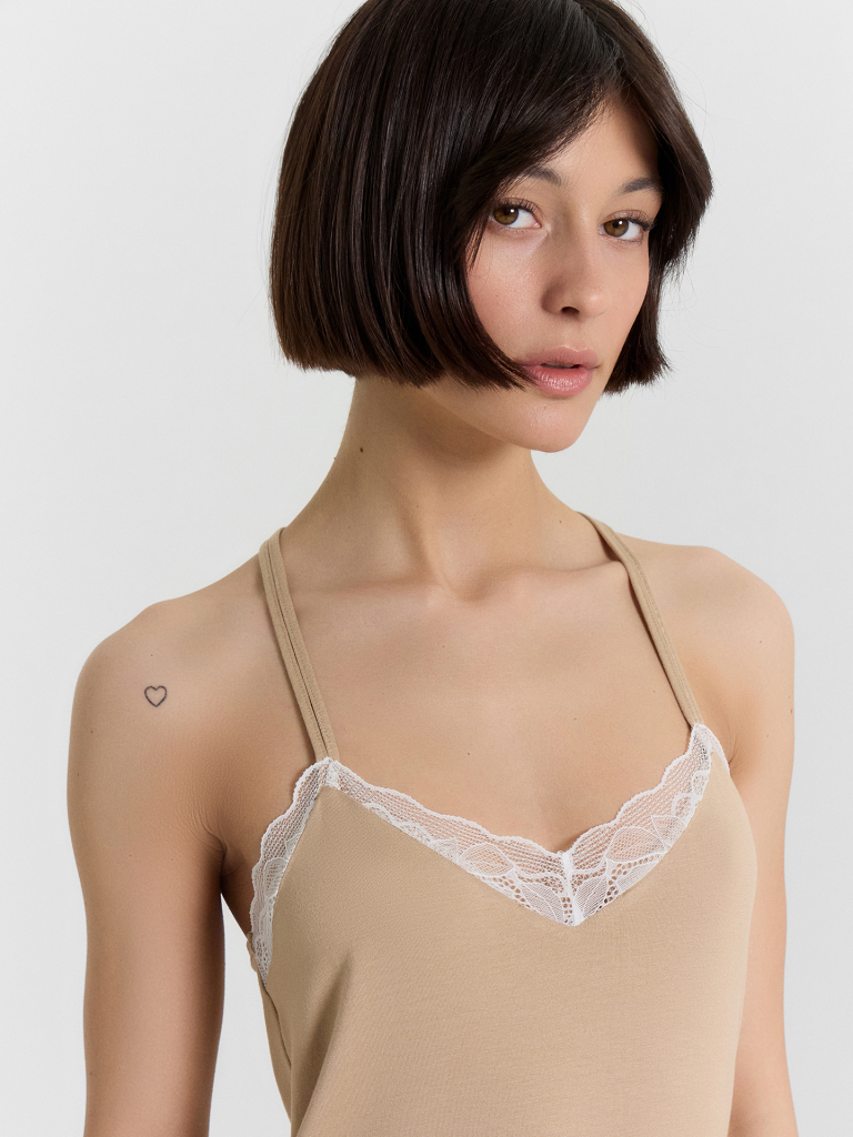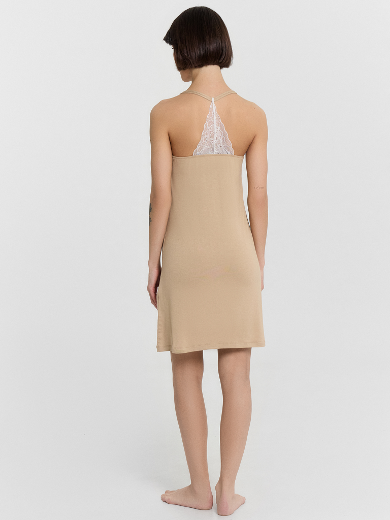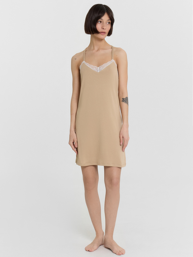 Очаровательная ночная сорочка из нежной вискозы. Длина мини, полуприлегающий силуэт, v-образный вырез горловины с декоративной кружевной отделкой, изящные бретели-спагетти... В такой сорочке сны будут исключительно приятными!