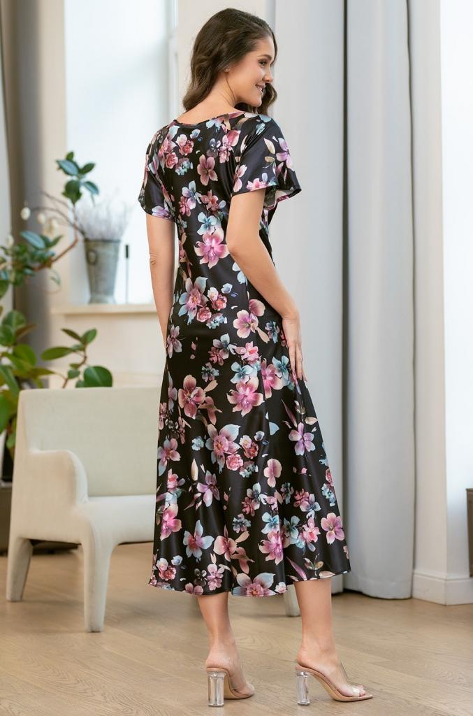 Длинная элегантная сорочка Mia-Amore полуприлегающего силуэта с коротким рукавом, выполнена из принтованного смесового шелка. Декор - маленький атласный бантик с подвеской по центру выреза сорочки.