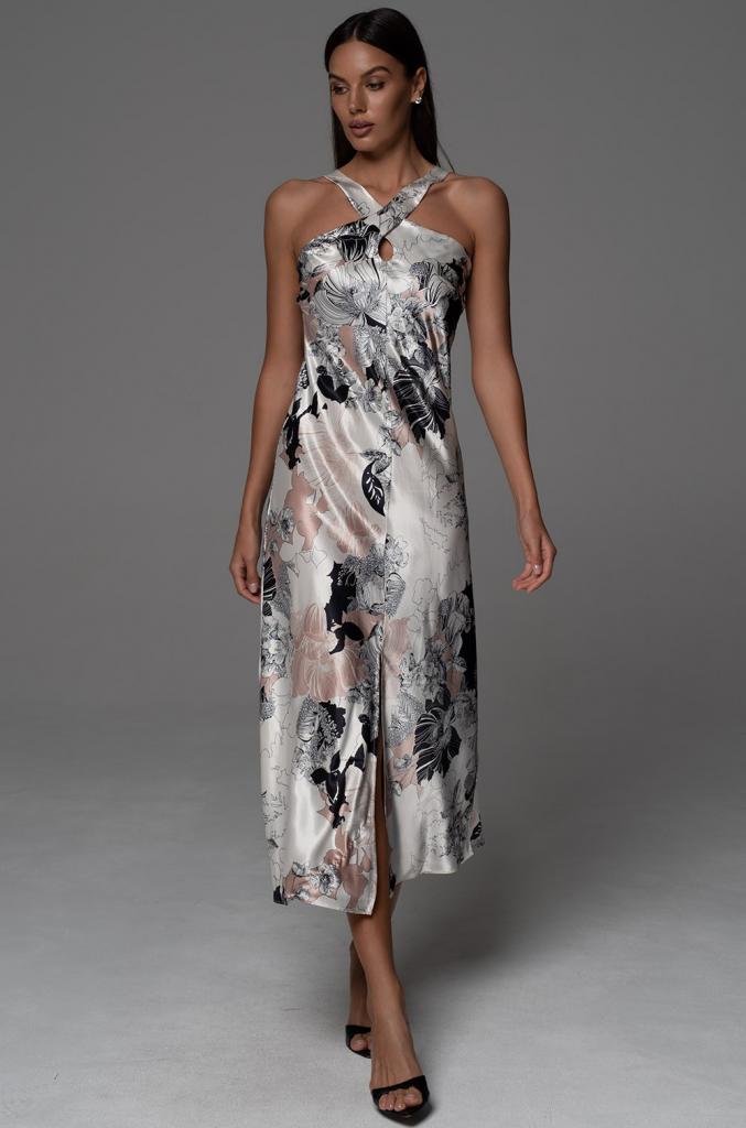 Элегантное длинное платье-комбинация Mia-Amore полуприлегающего силуэта, на широких бретелях, без подреза под грудью. Изделие выполнено из принтованного смесового шелка. По центру низа изделия расположен разрез для свободы движения.
