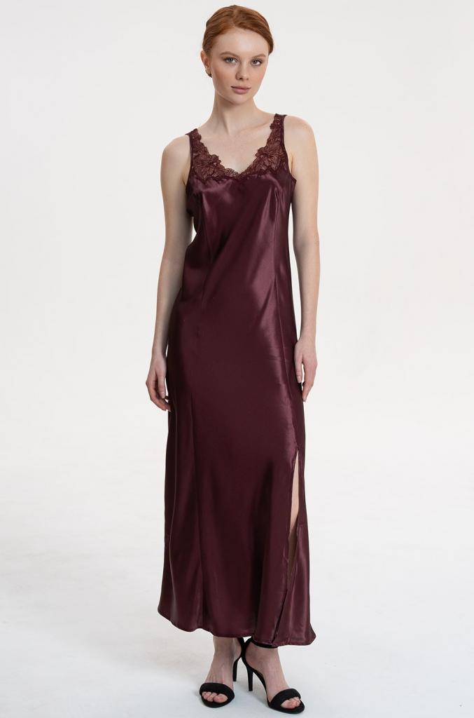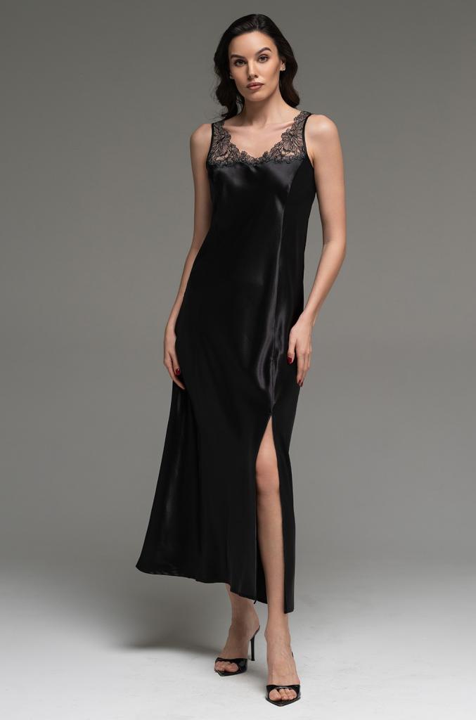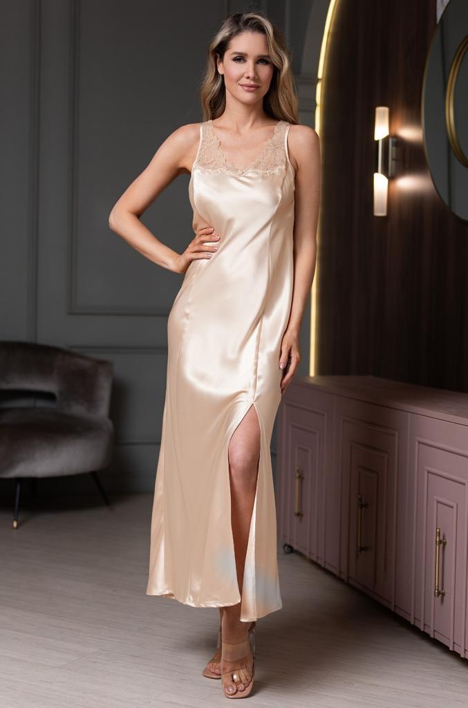 Длинная сорочка Mia-Amore выполнена из однотонного смесового шёлка. Бретели сорочки маечного типа, изысканный силуэт сорочки образуют вертикальные рельефы спереди и сзади. Горловину сорочки сверху украшают вставки из изысканного вышитого кружева.