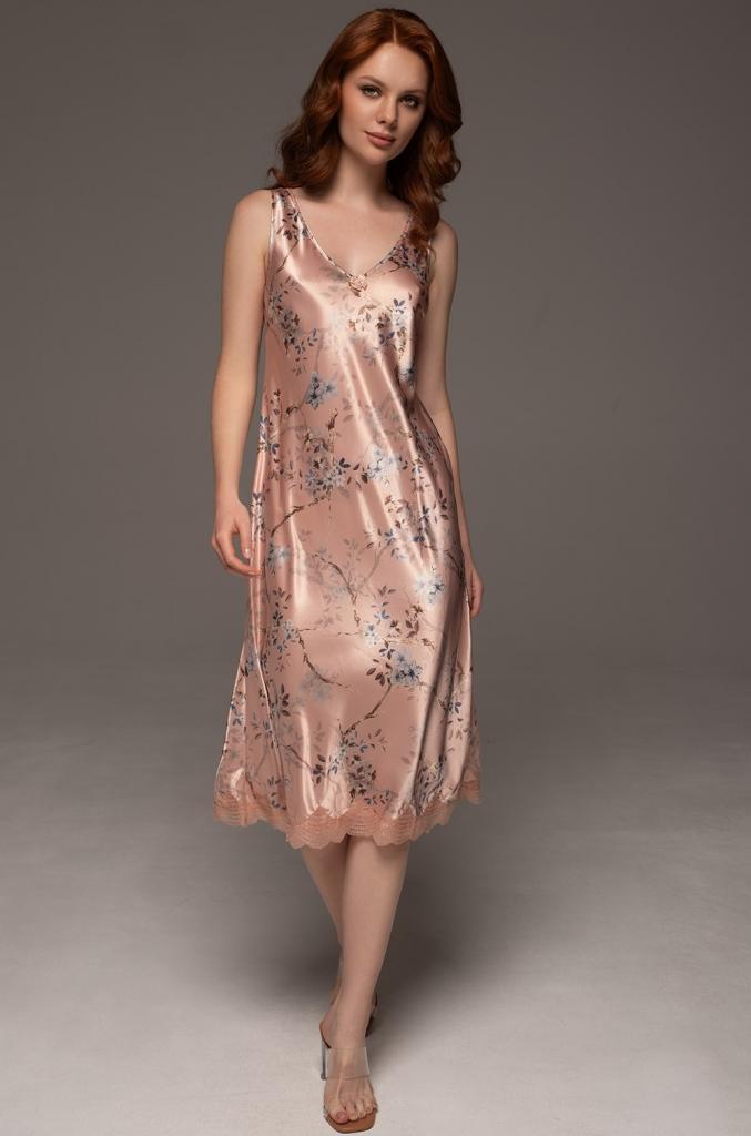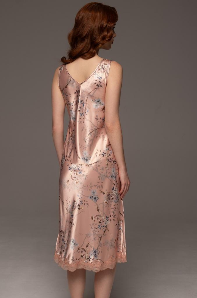 Сорочка Mia-Amore ниже колена с широким бретелями выполнена из принтованного смесового шёлка. Низ сорочки декорирован изящным вышивным кружевом.