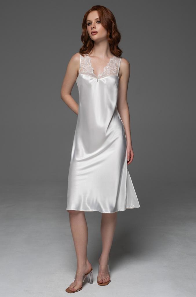 Длинная сорочка Mia-Amore выполнена из однотонного смесового шёлка. Бретели сорочки маечного типа, лиф сорочки сверху украшают вставки из изысканного вышитого кружева.