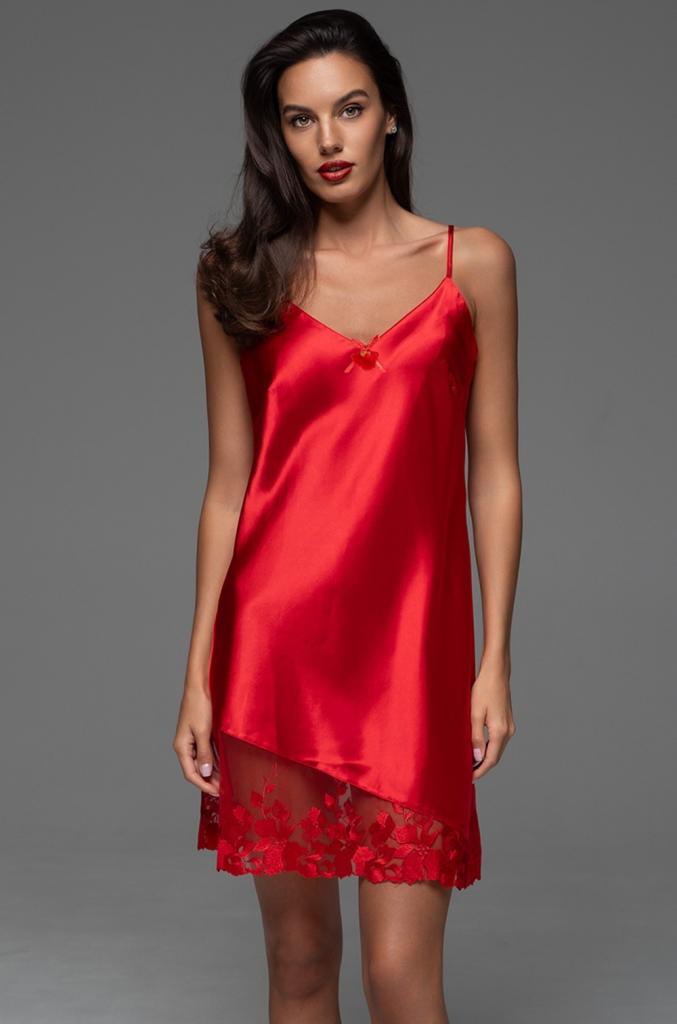 Короткая сорочка Mia-Amore полуприлегающего силуэта на тонких бретелях без подреза под грудью, выполнена из однотонного смесового шелка с кружевными асимметричными вставками по линии низа и верху спинки. Декор-атласный бантик с подвеской по центру выреза.
