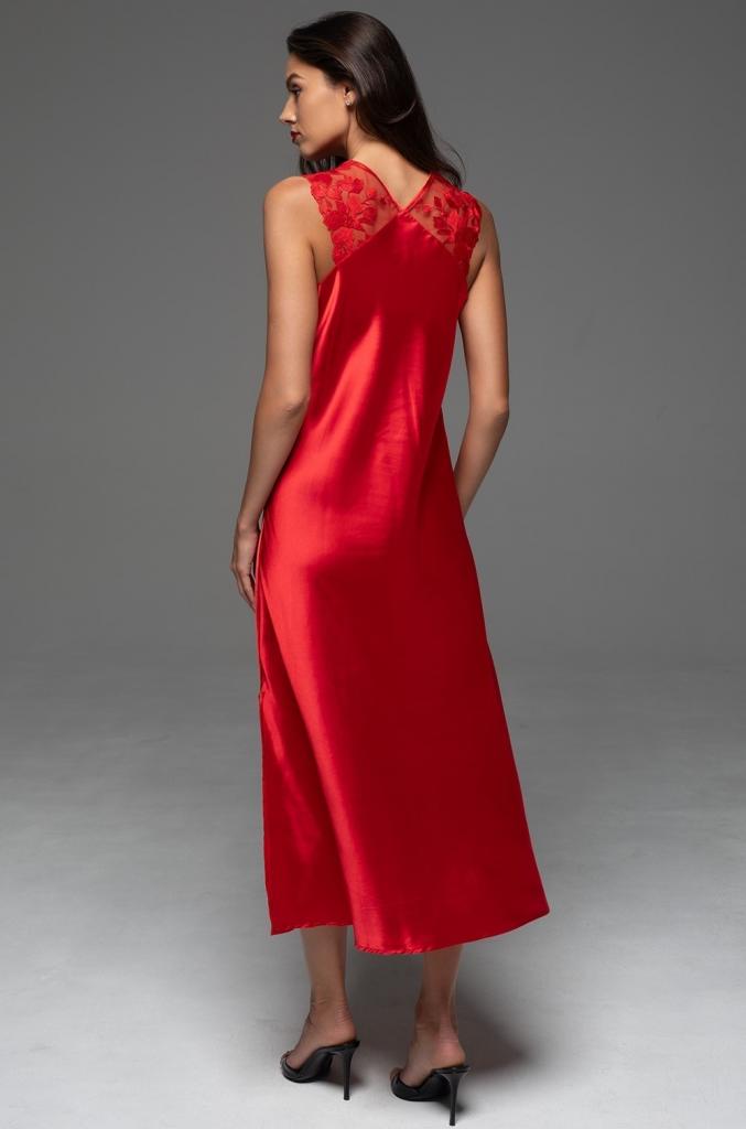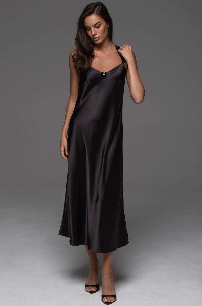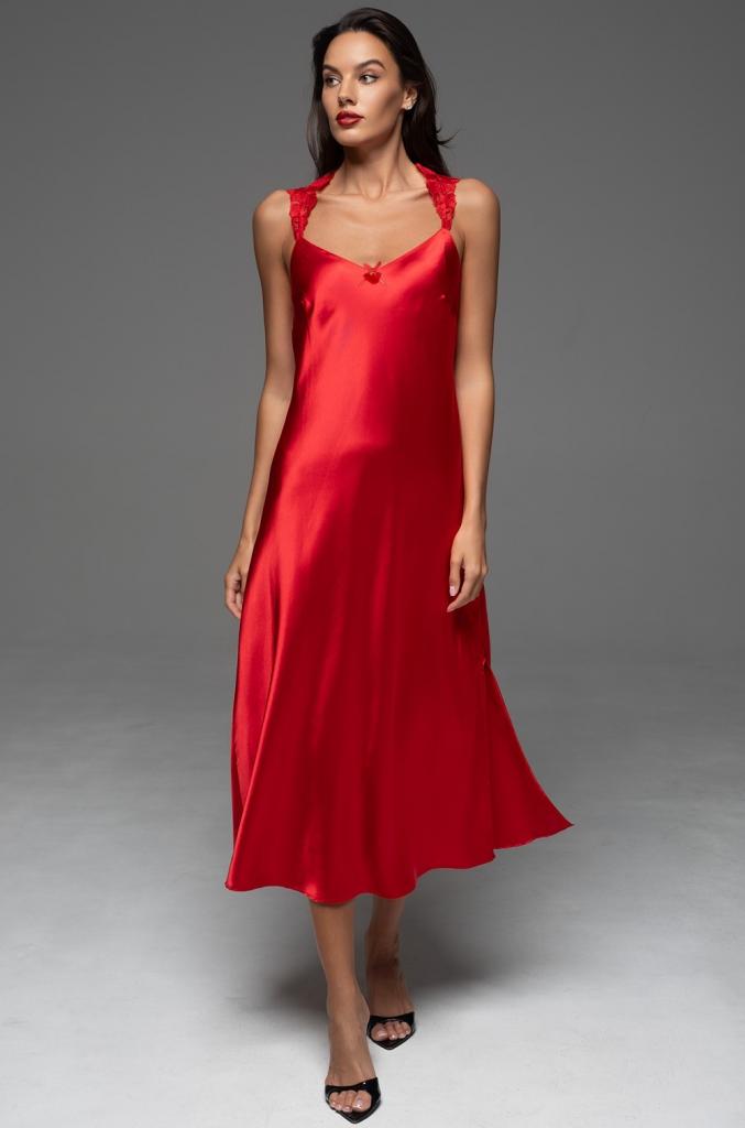 Длинная сорочка Mia-Amore полуприлегающего силуэта на широких кружевных бретелях без подреза под грудью. По левому боку расположен разрез для свободы движения. Сорочка выполнена из однотонного смесового шелка. Декор-атласный бантик с подвеской по центру выреза.