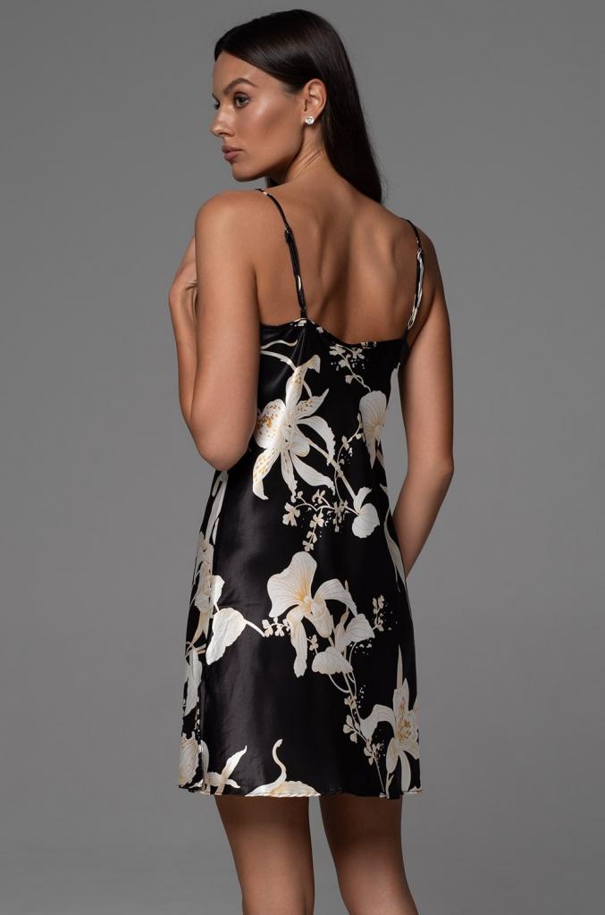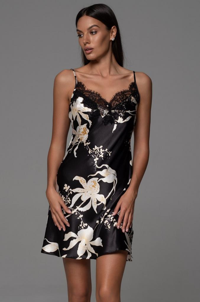 Короткая сорочка Mia-Amore без подреза на тонких регулируемых бретелях выполнена из принтованного смесового шёлка. Лиф сорочки украшен изящным широким кружевом. По центру лифа бантик.