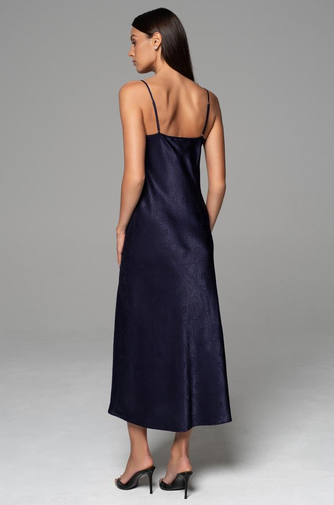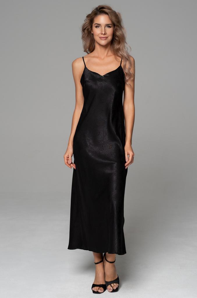 Элегантная длинная сорочка Mia-Amore на тонких бретелях без подреза под грудью с фигурным вырезом. Изделие выполнено из смесового шелкового жаккардового полотна. По низу боковых швов обработаны разрезы для свободы движения. Декор - атласный бантик с подвеской по центру выреза.