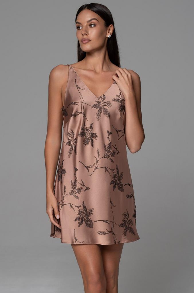 Короткая сорочка Mia-Amore без подреза на тонких регулируемых бретелях выполнена из жаккардового двухцветного смесового шёлка. Спереди по лифу V-образный вырез головины, на спинке классические тонкие бретели.