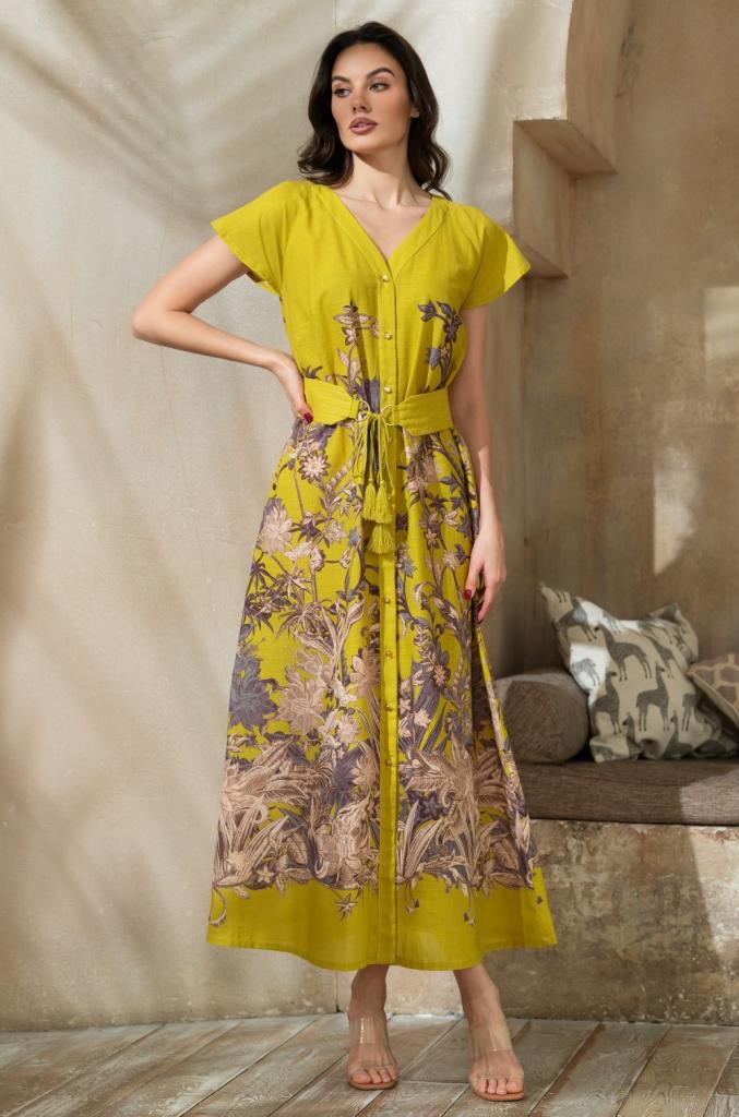 Длинное платье-туника Mia-Amore с центральной застежкой на пуговицы и с коротким рукавом. В боковых швах обработаны карманы. Линию талии можно подчеркнуть за счет эффектного широкого пояса с кистями, который идет в комплекте. Изделие выполнено из натурального материала с купонным принтом.