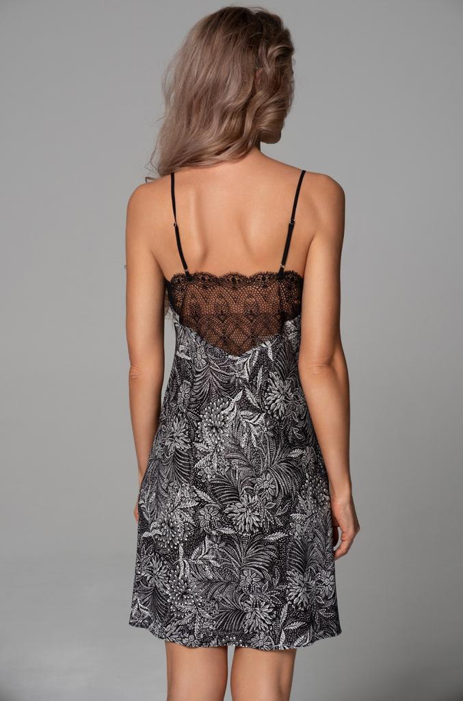 Короткая сорочка Mia-Amore на тонких бретелях, без подреза под грудью, полуприлегающего силуэта. Изделие выполнено из тканой принтованной вискозы с кружевными вставками по верху изделия. По низу боковых швов расположены разрезы для свободы движения. Декор-атласный бантик по центру выреза.