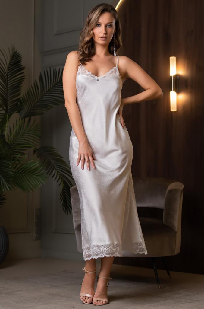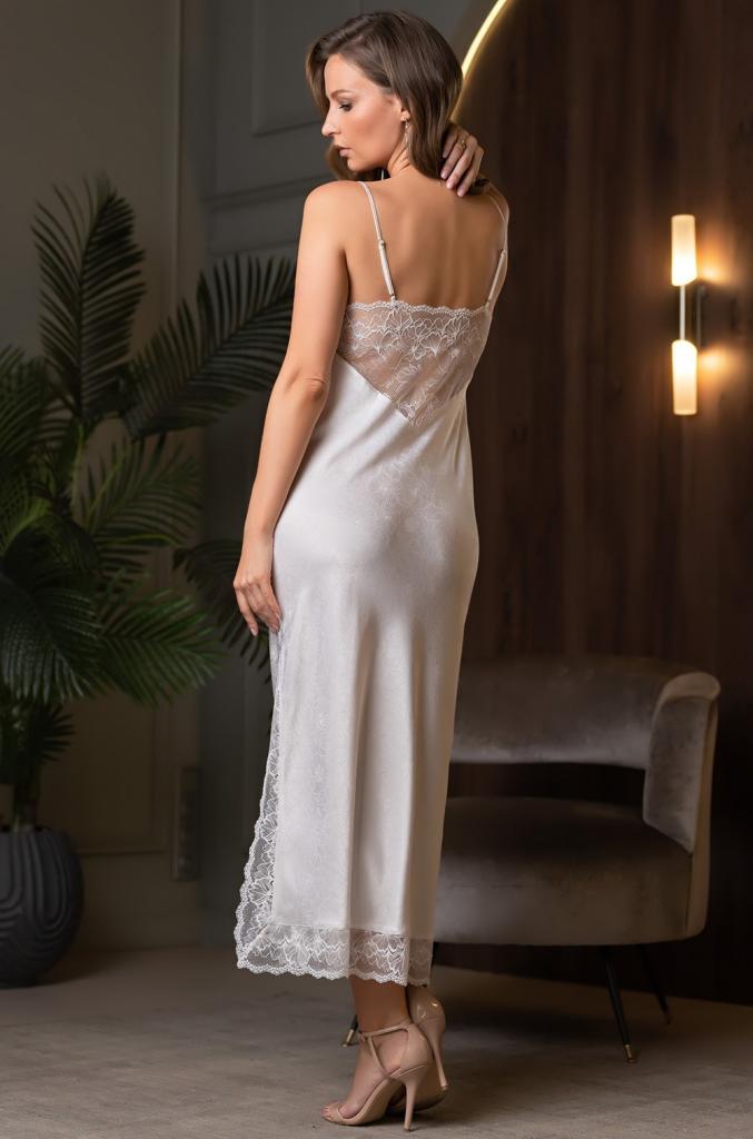 Длинная сорочка Mia-Amore на тонких бретелях без подреза под грудью. Изделие выполнено из однотонного искусственного шелка на жаккардовой основе. Ажурное кружево украшает верх и низ сорочки. По левому боку расположен пикантный разрез. Декор - атласный бантик с подвеской, расположенный по центру выреза изделия.