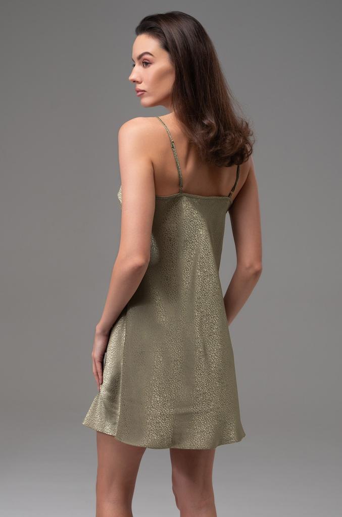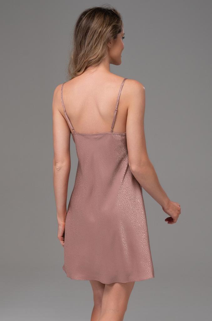 Короткая сорочка Mia-Amore на тонких бретелях без подреза под грудью, выполнена из однотонного искусственного шелка на жаккардовой основе.