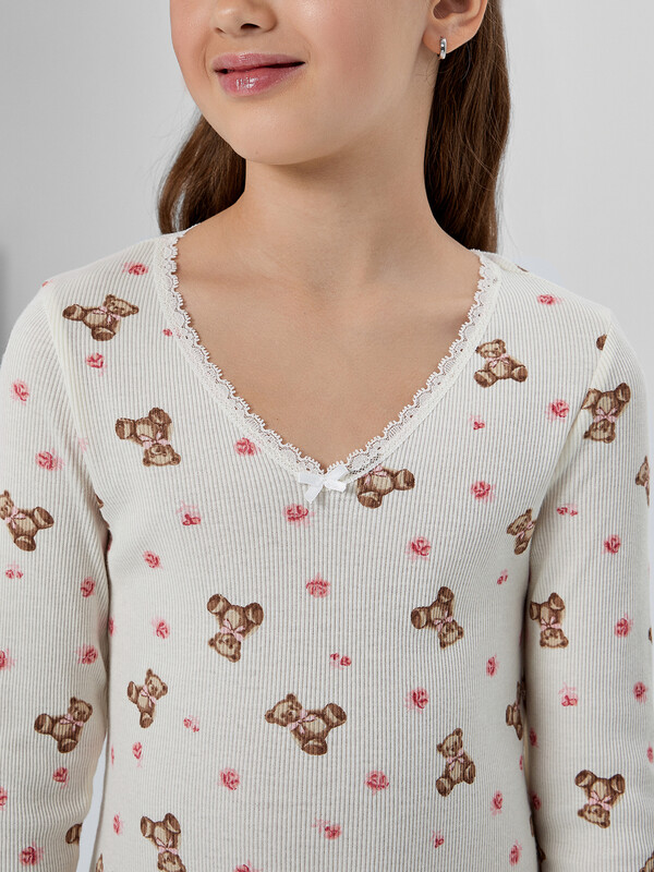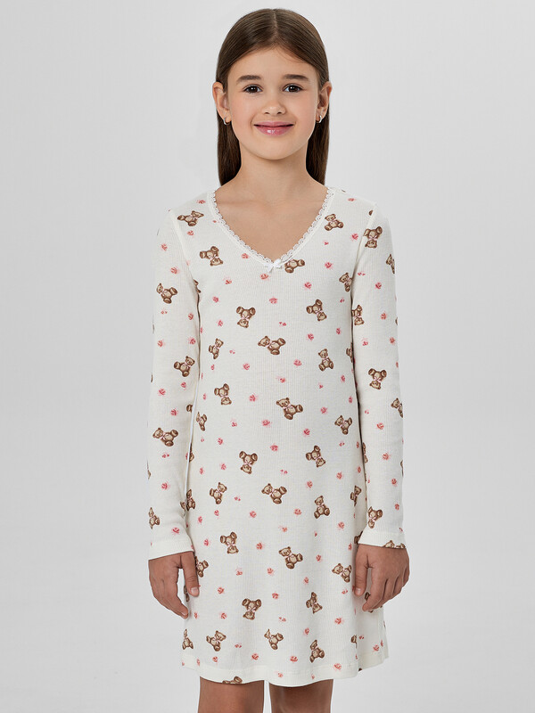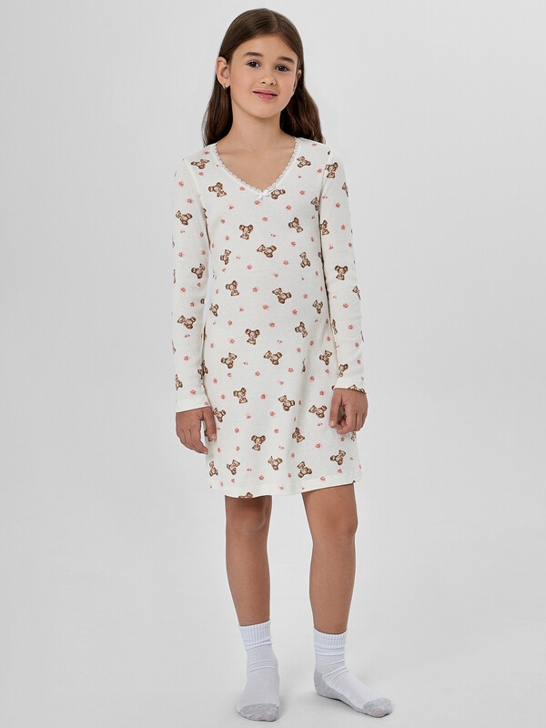 Сорочка полуприлегающего силуэта для девочек. Горловина V-образной формы, обработана кружевом Devsel L20166-1.5, ширина 15мм. Рукава длинные втачные, одношовные. Перед и спинка цельнокроеные. Низ изделия и рукавов обработаны на 2-х игольной плоскошовной машине швом в подгибку.