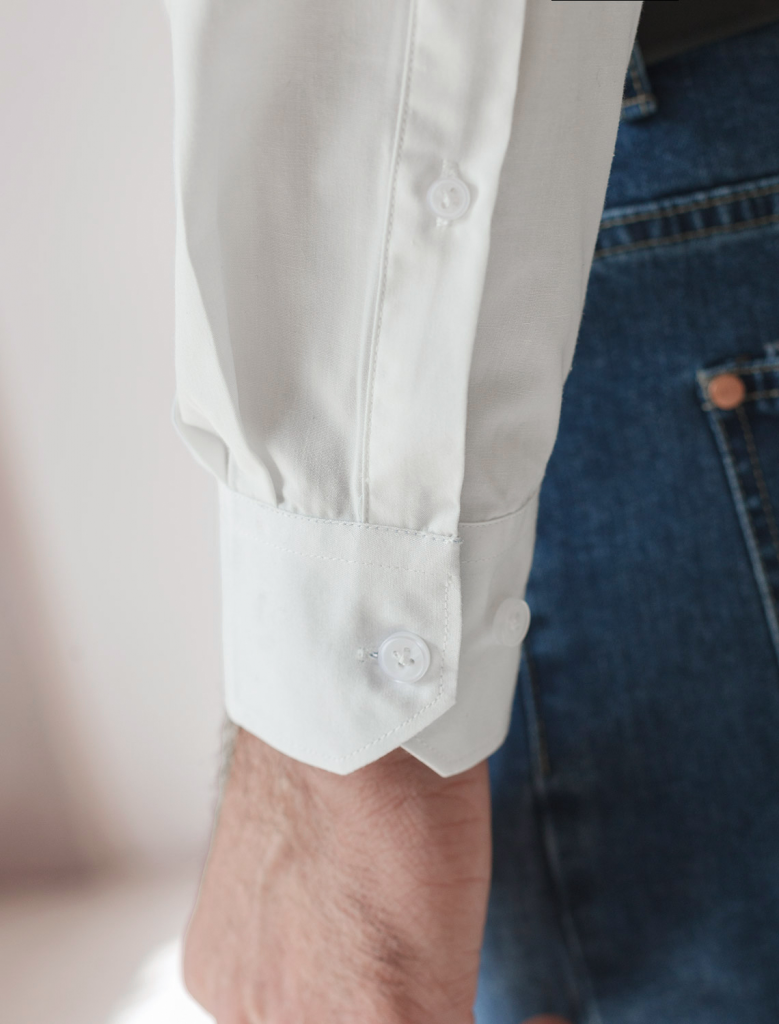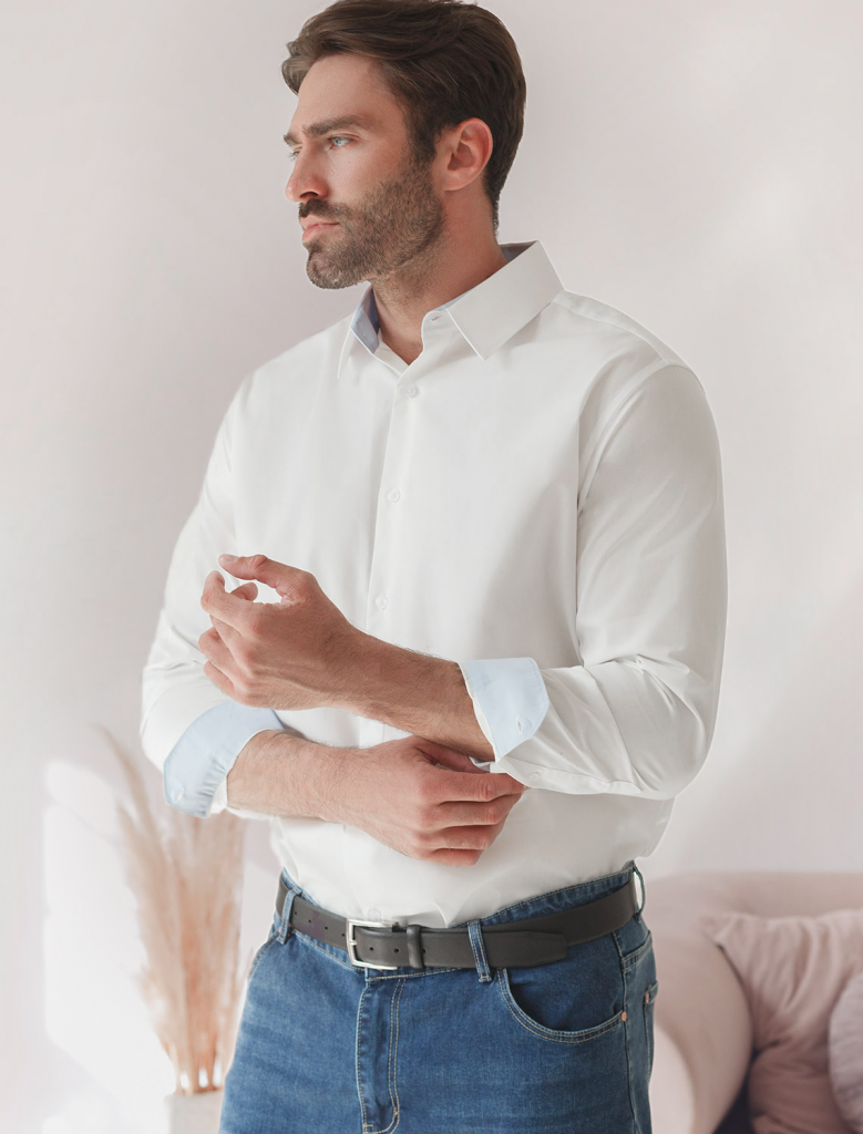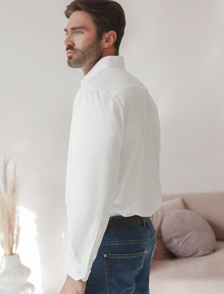 Классическая офисная белая рубашка из премиального хлопка с добавлением эластана идеально подходит для повседневной работы. Натуральный материал обладает дышащими свойствами, а эластан в составе обеспечивает правильную посадку на фигуре. Отложной воротник придает образу аккуратность, а манжеты на рукавах фиксируются пуговицами, позволяя регулировать степень облегания. Белый цвет подчеркивает строгость и свежесть внешнего вида — такой вариант легко сочетается с любым стилем, например, деловым или кэжуал. Прямой крой Classic-Fit делает рубашку практичной для мужчин разных размер, в том числе и больших, а так же комфортной при длительном ношении. Беспроигрышные варианты — это сочетания с классическими брюками для делового стиля, а для повседневных образов можно использовать джинсы, брюки-чинос и даже шорты. Для завершения образа подбирайте обувь, соответствующие стилю: от лоферов и дерби до кед и кроссовок.