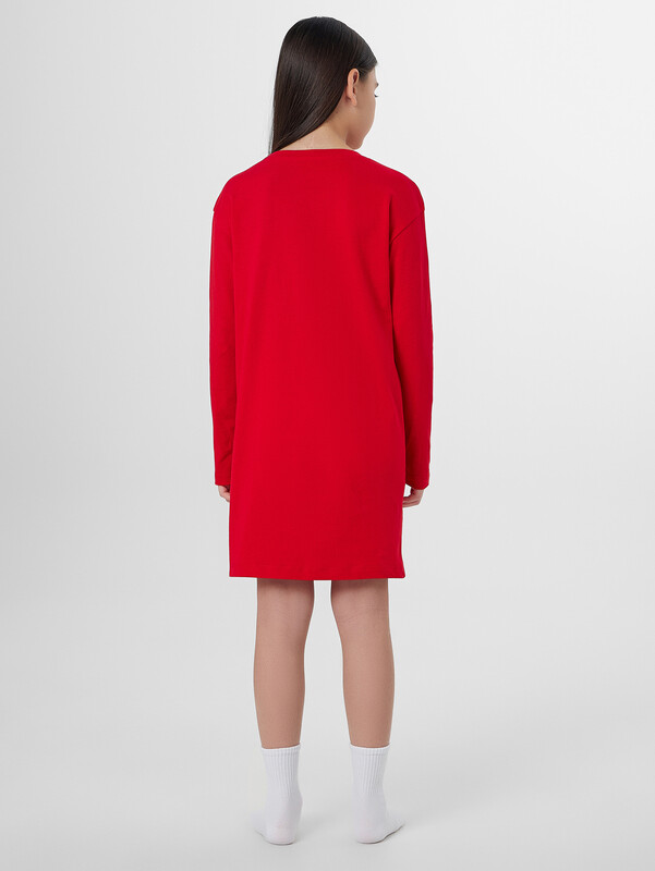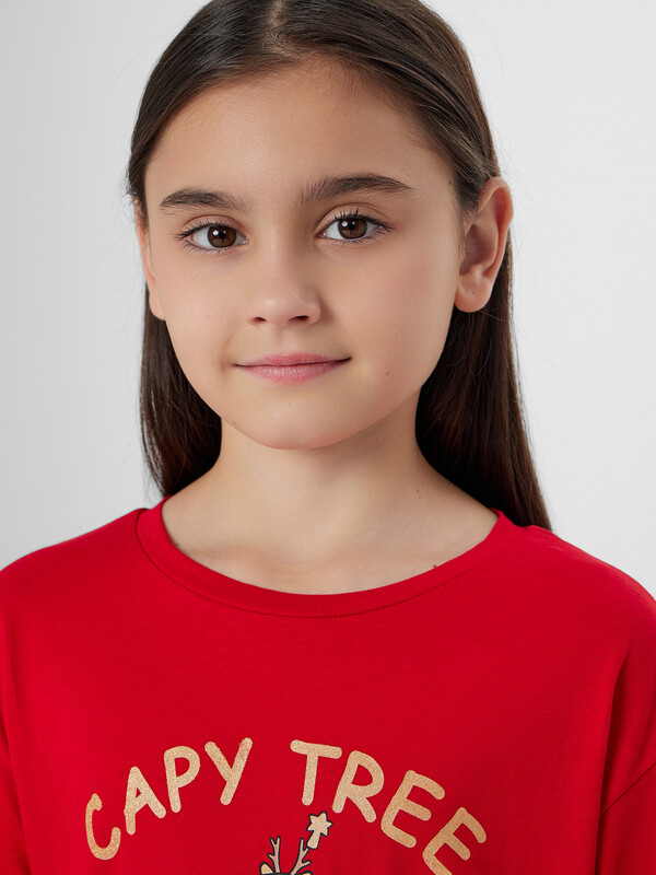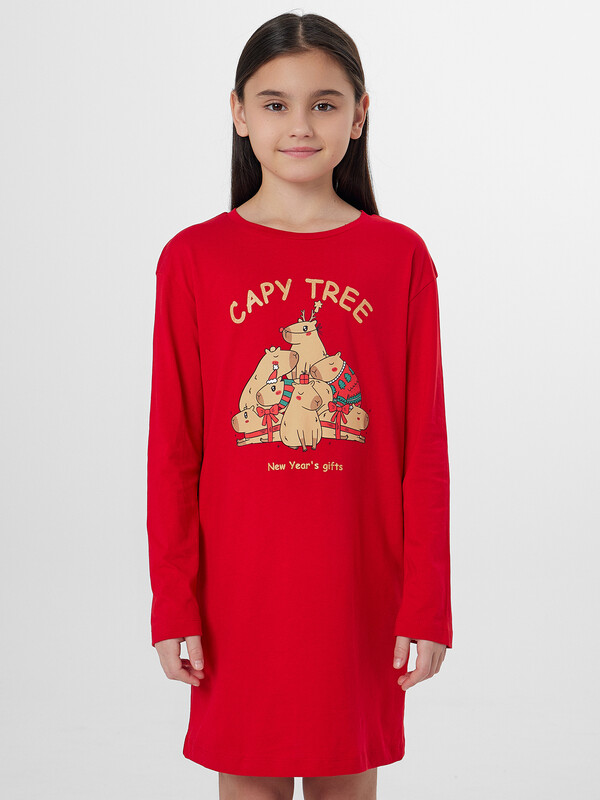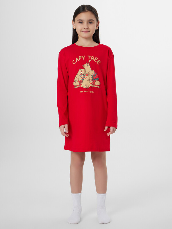 Яркая красная сорочка для девочек с праздничной надписью «Новогодние подарки» создана для самых волшебных снов в преддверии праздника. Модель прямого свободного силуэта обеспечивает максимальную свободу движений и комфорт во время сна. Аккуратная круглая горловина, выполненная из основного материала, нежно облегает шею, не вызывая раздражения.