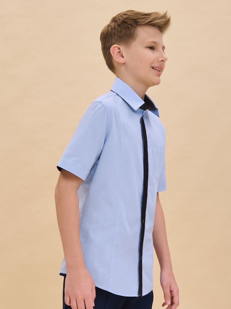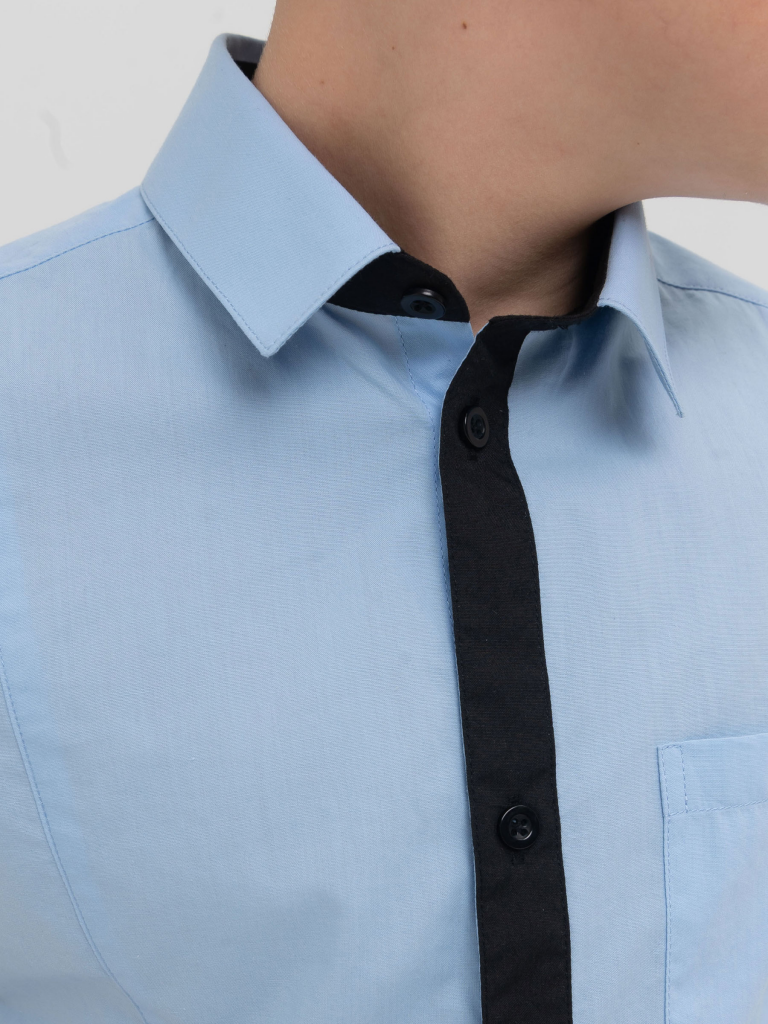 Школьная рубашка для мальчика из практичной ткани с современными деталями. Самые уязвимые для грязи детали выполнены из ткани контрастного цвета. Это разбавляет официальный стиль и позволяет не стирать белую рубашку каждый день. А если отвернуть манжеты, то внутренний текстовый принт НОРМ на них превратит рубашку в модную крутую модель. Материал рубашки практичен, его легко стирать и гладить. Хорошо держит форму и даёт телу дышать. Не ограничивает движения и переживёт любую активность подростка.