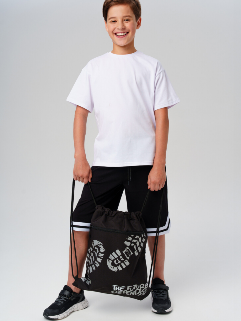 Сумка-мешок для сменной обуви из прочной водонепроницаемой ткани для мальчика подростка. Модель имеет светоотражающий принт. Мешок для сменки для школьника с вместительным отделением, затягивающимся двумя шнурками. Дополнительный внешний карман застегивается на молнию. Размер мешка 39*48 см. Это отличный вариант для школы и детского садика. В него можно складывать не только сменную обувь, но и спортивную одежду для физкультуры и секций, брать в путешествия. Он легкий и компактный. К мешку для сменки можно подобрать рюкзак и пенал в едином дизайне.