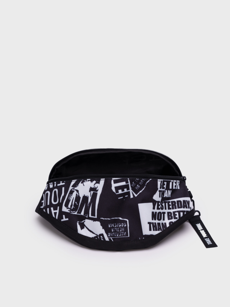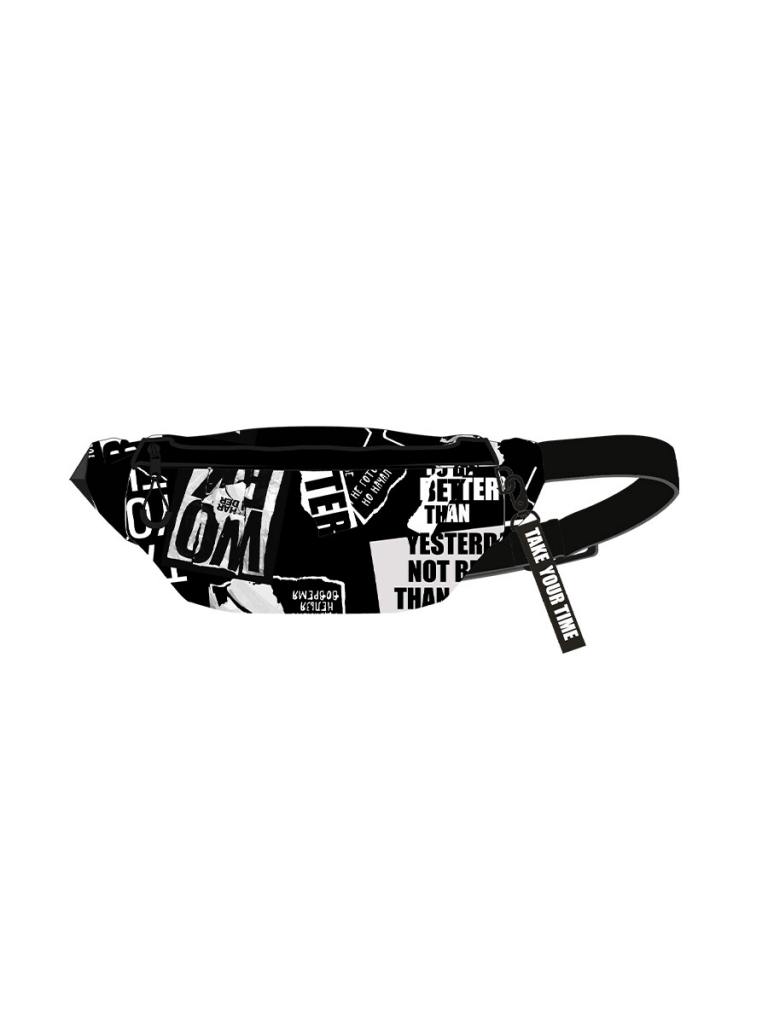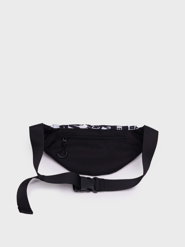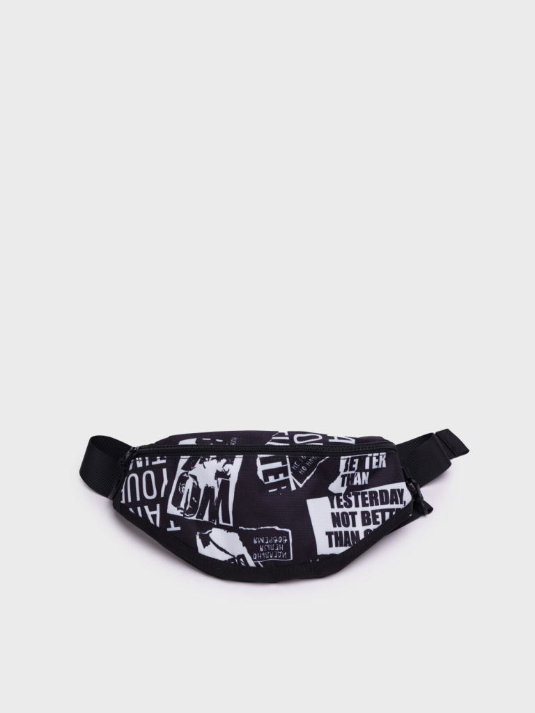 Стильная принтованная поясная сумка для мальчика-подростка в черно-белой гамме. Регулируемый ремень. Основной отсек на молнии. Внутри есть карман на липучке. Параметры: высота - 14 см, ширина -30 см, глубина - 8 см.