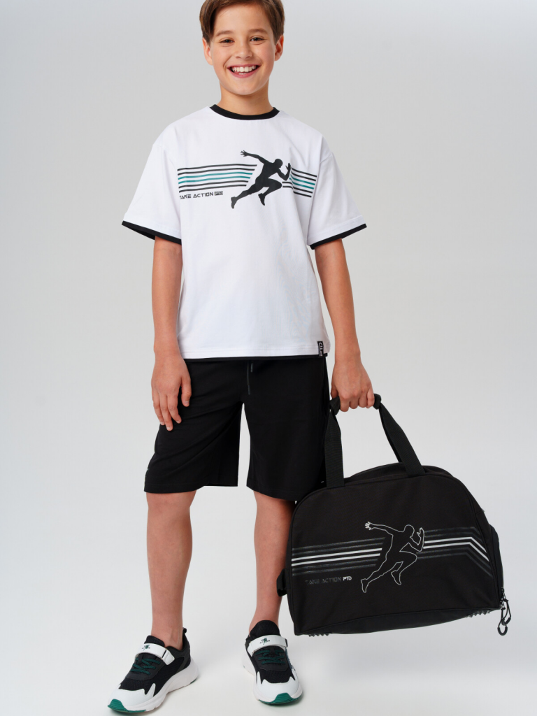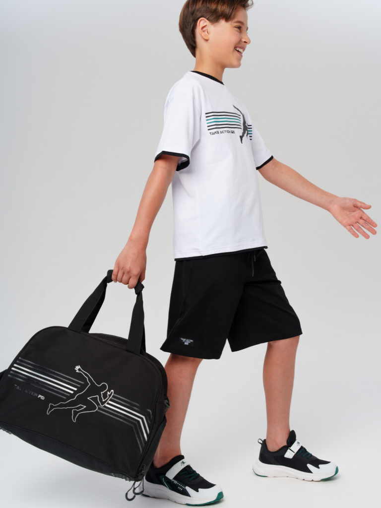 Спортивная сумка для мальчика подростка. Сумка текстильная, ручки с креплением, плечевой регулируемый ремень, карман передний на молнии, карман для обуви, внутренний карман на молнии, маленький карман для телефона, проездных документов или карт, светоотражающий принт. Снизу дна имеются резиновые ножки, чтобы низ сумки не пачкался. Размер сумки: 43*28*21 см.