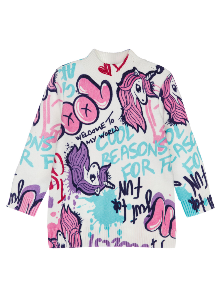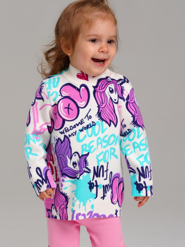 Свитер детский для девочки. Модный свитер жаккардовой вязки с высоким содержанием вискозы. Вискоза хорошо поглощает влагу, отлично пропускают воздух. Изделия приятны к телу, и не вызывают раздражения. Модель из капсульной коллекции PRETTY-UNICORN (ЮНИКОРН). Соберите полный образ в едином стиле!