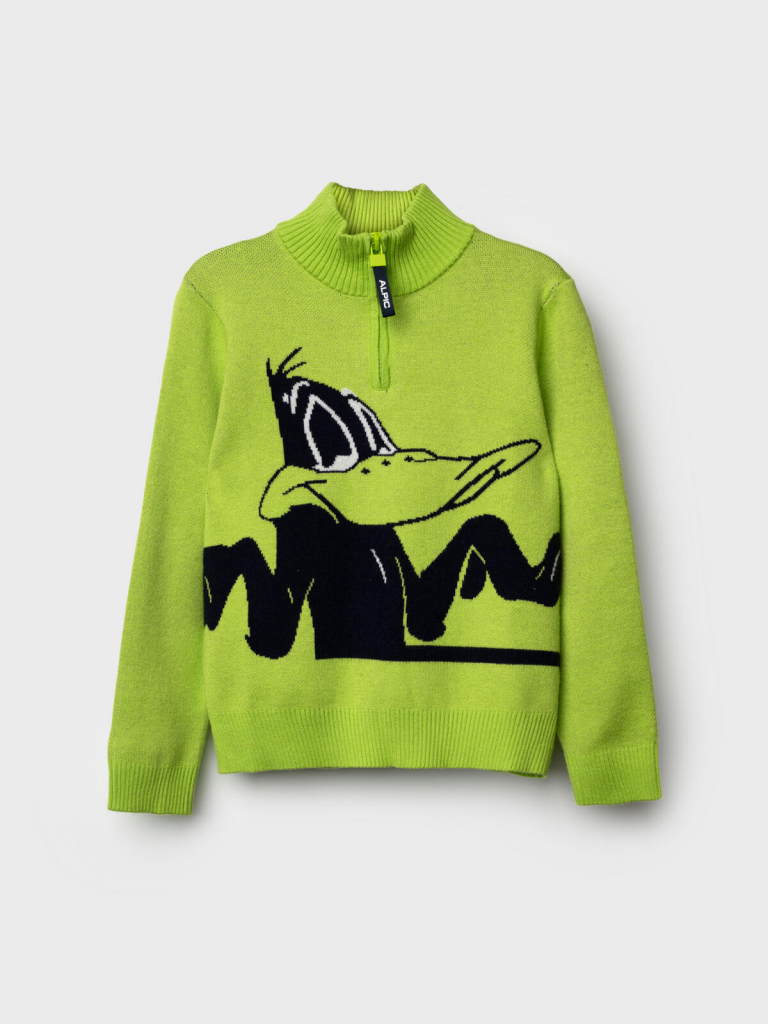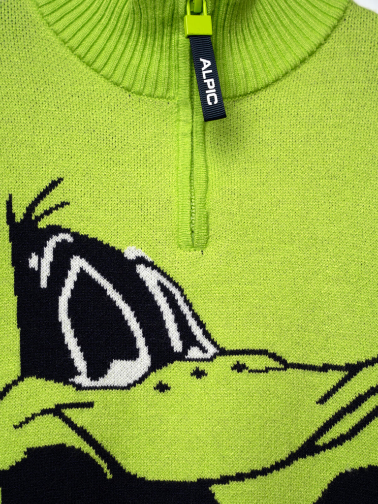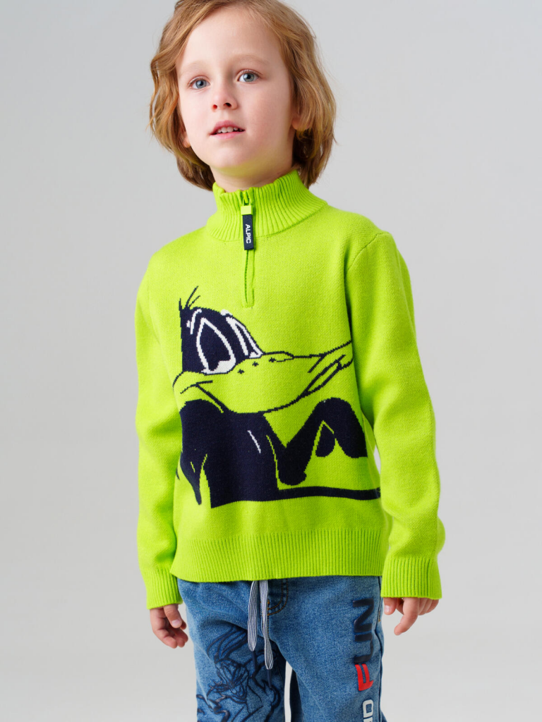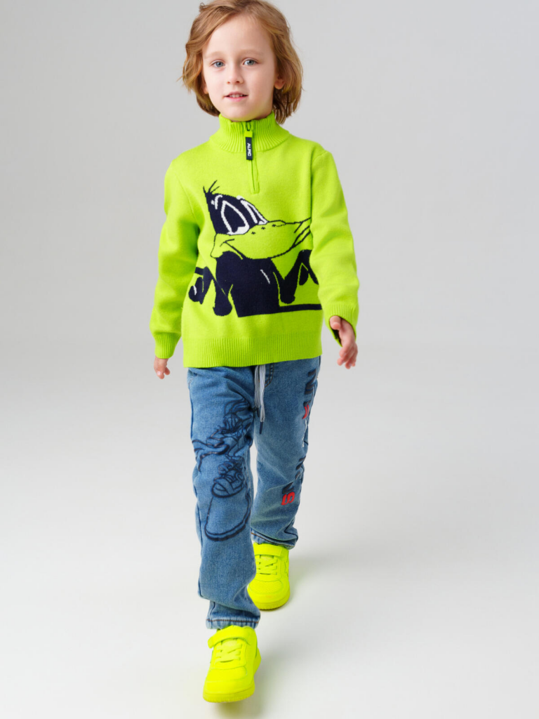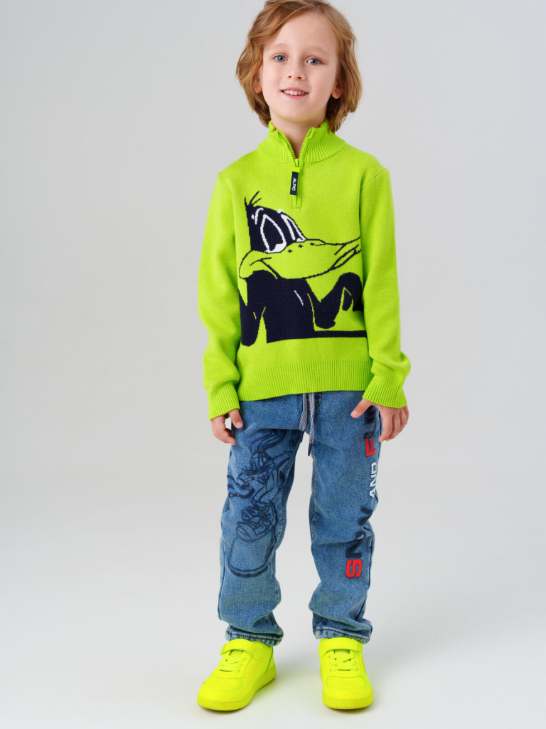 Детский зелёный свитер с принтом Даффи Дака для мальчика от PlayToday — яркая и комфортная модель с лицензионной графикой. Такой свитер поднимает настроение, легко комбинируется с базовой одеждой и идеально подходит как для прогулок, так и для повседневной носки.Преимущества модели:+ вискоза в составе — мягкая и дышащая, комфортна к телу, не вызывает раздражения+ нейлон — сохраняет форму и устойчив к износу+ высокий ворот с молнией — защита от ветра и лёгкость при переодевании+ яркий принт с Даффи Даком — эффектный акцент в образе+ плотная, но лёгкая вязка — комфорт в прохладное времяСоветы по стилю:Этот зелёный свитер отлично сочетается с джинсами, спортивными брюками или утеплёнными штанами. Добавьте жилет или куртку — и стильный аутфит для прогулки готов. Для более домашнего варианта подойдёт комбинация с трикотажными брюками. Яркий цвет и мультяшный герой сделают образ запоминающимся и весёлым.Когда и как носить:Идеален для осени, зимы и начала весны. Удобен для детского сада, дома, прогулок или поездок. Высокий ворот защищает шею, а дышащая пряжа не перегревает — комфортно даже в помещении. Подходит для носки под куртку или комбинированно с термобельём в морозные дни.Размеры: 98-122 подойдет для мальчиков дошкольного и младшего школьного возраста.Свитер детский с Даффи Даком для мальчика от PlayToday — это тепло, яркость и немного мультяшного веселья каждый день!