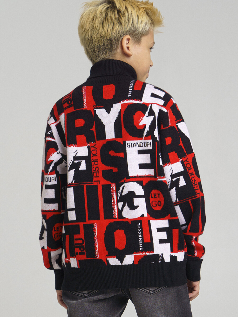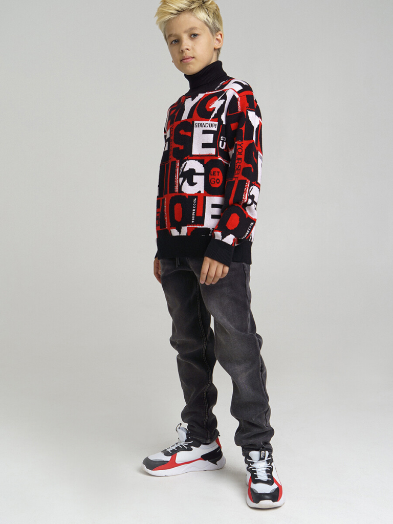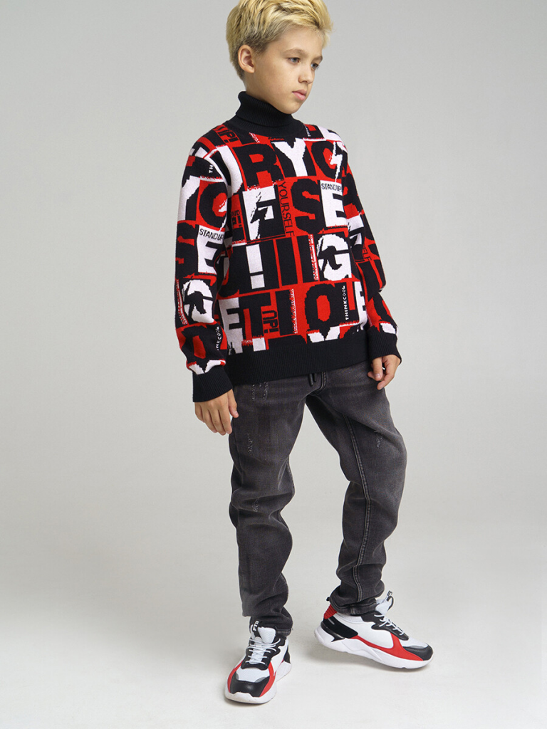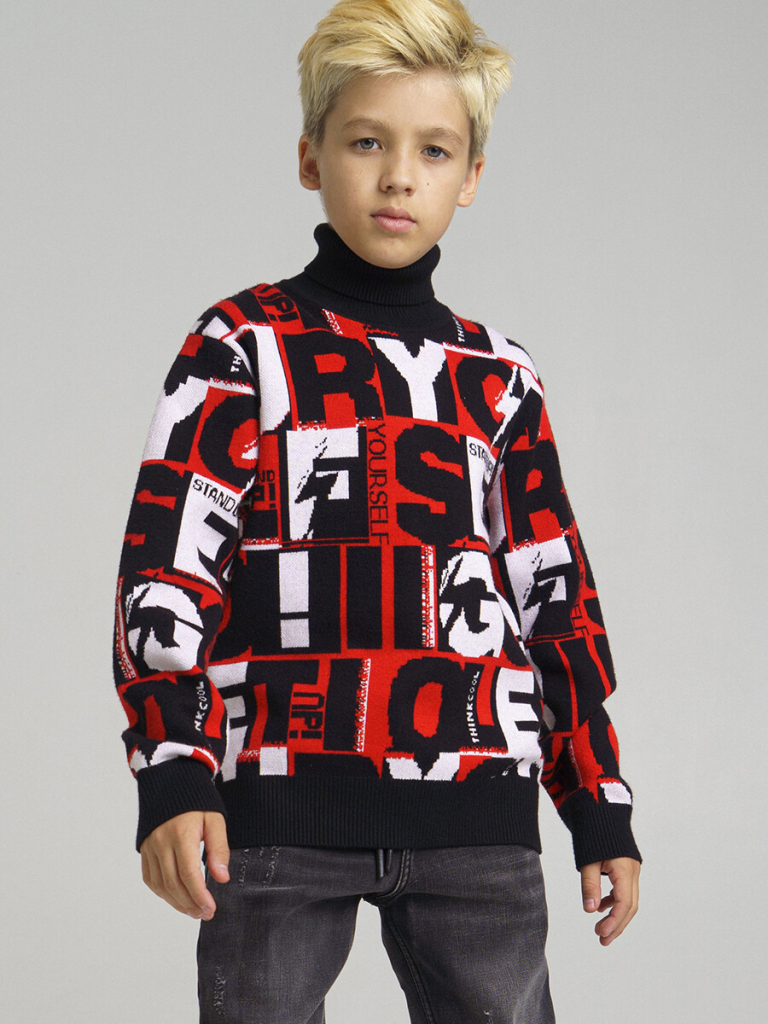 Жаккардовый свитер. Размер изделия на фото - 140, параметры модели (см): рост 137, обхват груди-талии-бедер: 68-58-75. Из уютного вязаного трикотажа. Приятный материал, обладающий высокой гигроскопичностью - 50% вискоза/ 50% нейлон. Горловина, манжеты и низ изделия в рубчик.