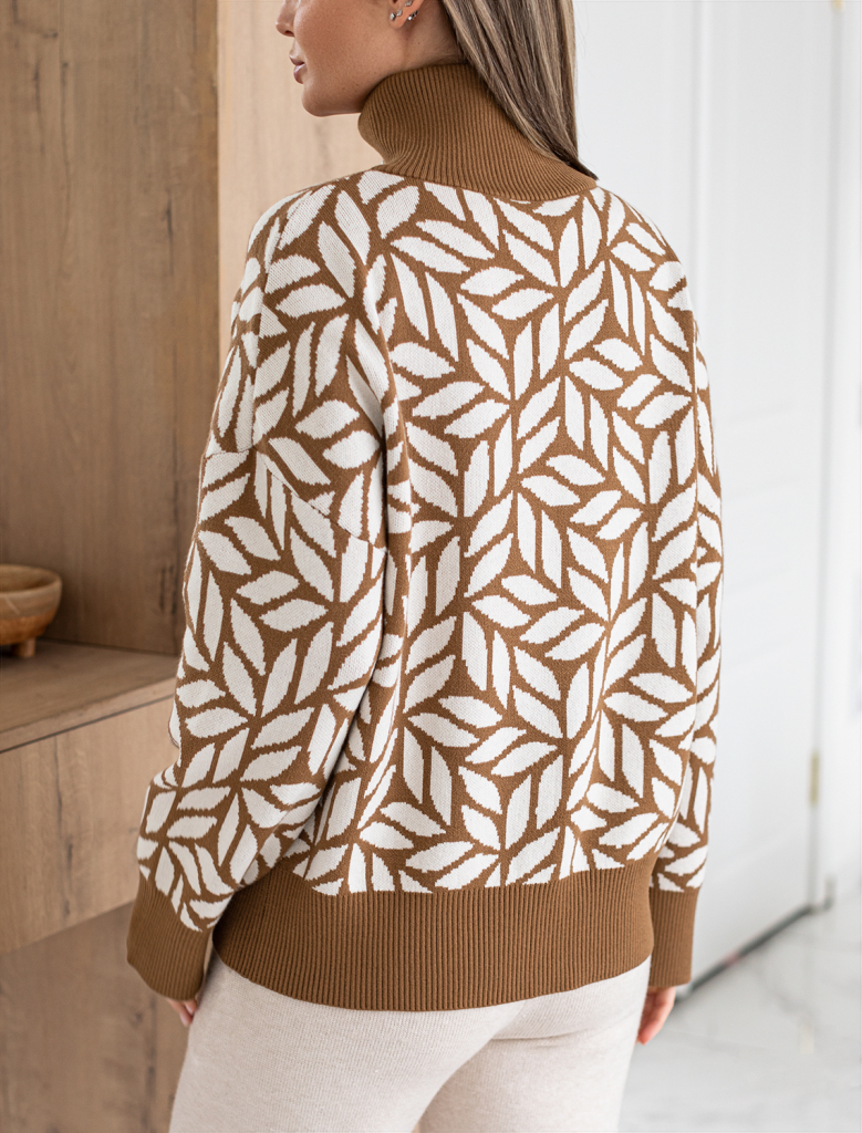 Джемпер с воротом на молнии двуслойной жаккардовой вязки выполнен из нежной пряжи на основе вискозы с добавлением кашемира. Мягкая модель с золотистой фурнитурой не раздражает кожу, приятно ощущается на теле и поддерживает комфортный микроклимат. Совет стилиста: такой джемпер может стать ключевым акцентом в сдержанном комплекте. Выбирайте однотонные низы в тон рибаны или на контрасте.