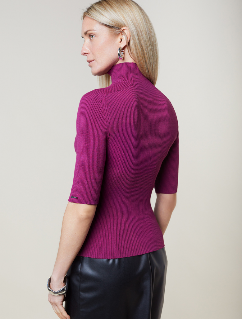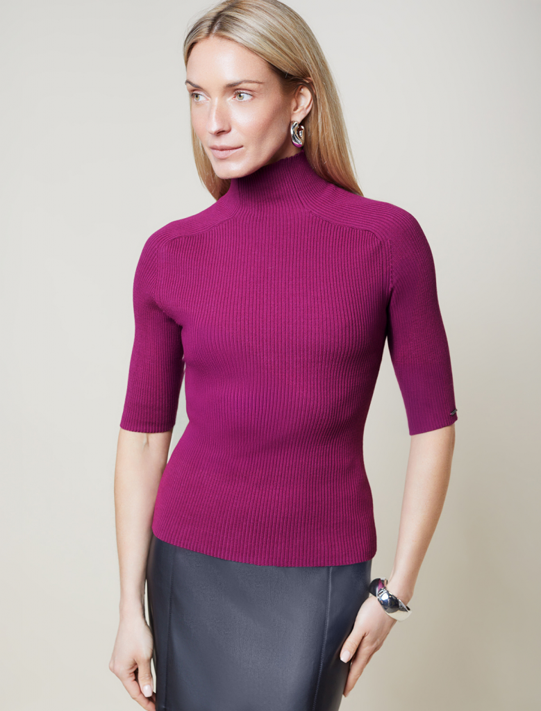 Водолазка тонкой вязки в рубчик выполнена из хлопка. Лаконичная модель с коротким рукавом дополнена металлическим логотипом бренда. Изделие идеально сидит по фигуре и не сковывает движений. Мягкая пряжа очень приятная к телу не колется и сохраняет тепло при этом не перегревая.