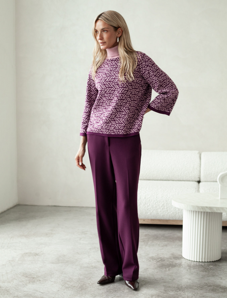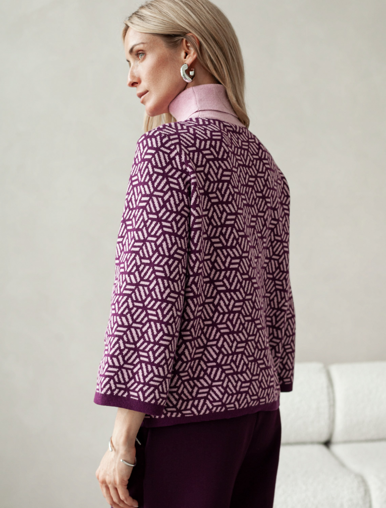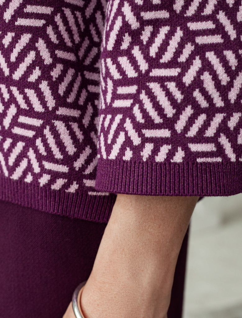 Свитер жаккардовой вязки выполнен из нежной пряжи на основе вискозы с добавлением кашемира. Модель свободного силуэта с укороченным рукавом подходит для любой фигуры. Жаккардовый узор выглядит дорого и роскошно, делая любой образ респектабельным. Нежная пряжа комфортно ощущается на теле, сохраняя оптимальное тепло при этом не перегревая