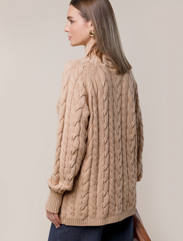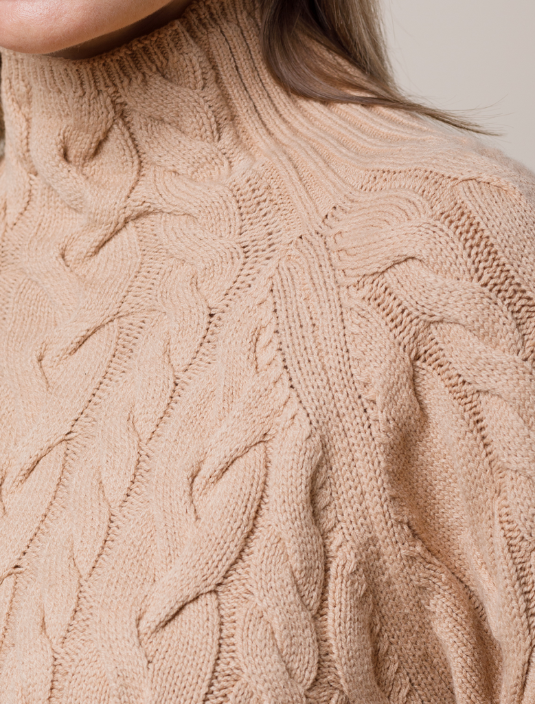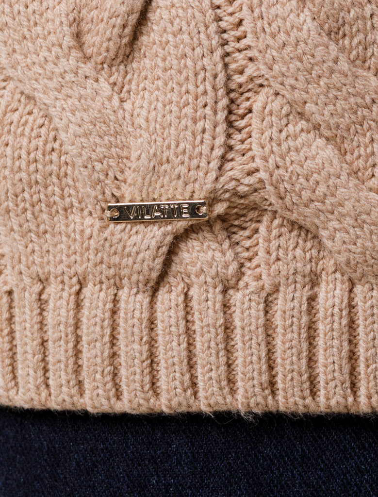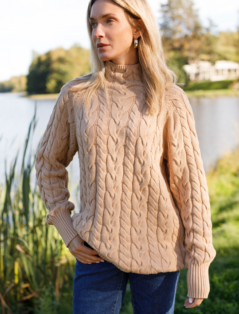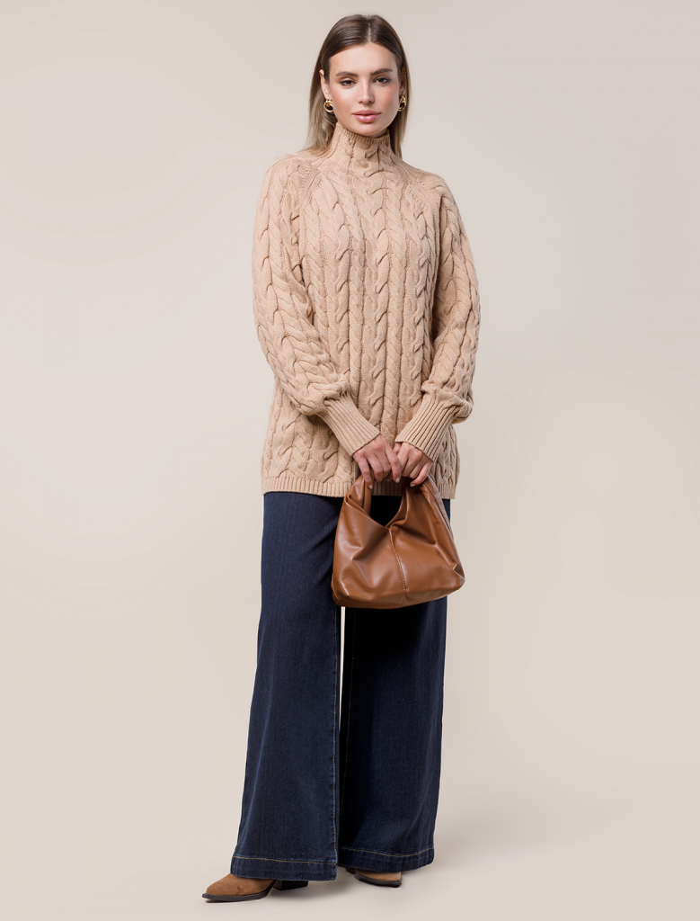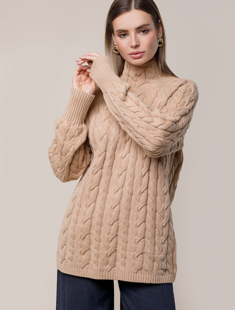 Свитер выполнен из мягкой хлопковой пряжи фактурной вязки с добавлением акрила. Удлиненная модель силуэта over-size с воротом-стойка и узором косы во всю длину. Хорошо поддерживает тепло, при этом не перегревая тело. Сохраняет первоначальный внешний вид даже после множества стирок. Свободный силуэт позволяет носить изделие на футболку или рубашку с любым низом. Из украшений металлический логотип бренда.