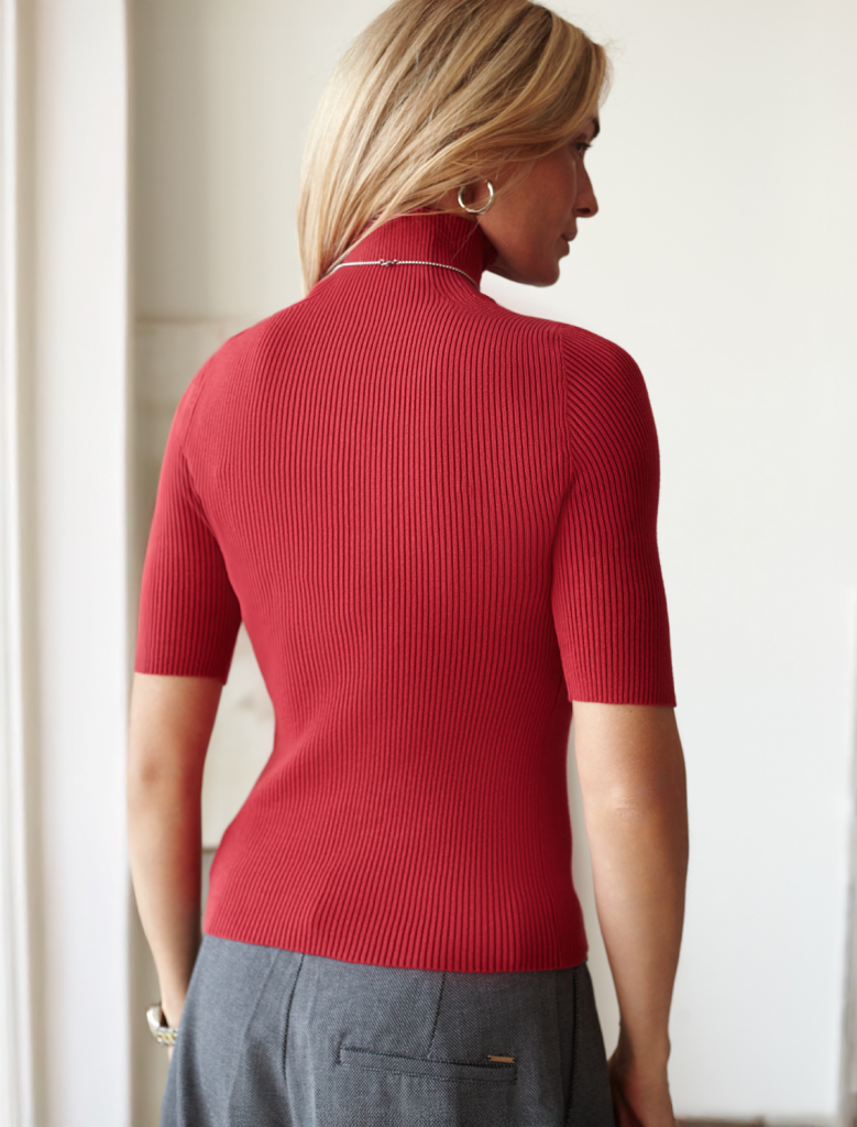Водолазка тонкой вязки в рубчик выполнена из хлопка. Лаконичная модель с коротким рукавом дополнена металлическим логотипом бренда. Изделие идеально сидит по фигуре и не сковывает движений. Мягкая пряжа очень приятная к телу не колется и сохраняет тепло при этом не перегревая.