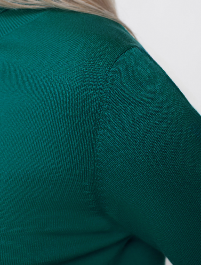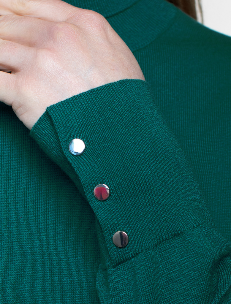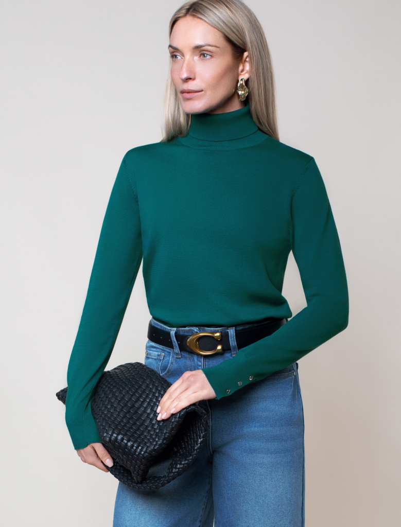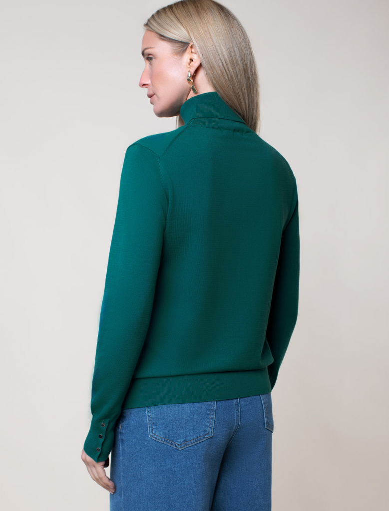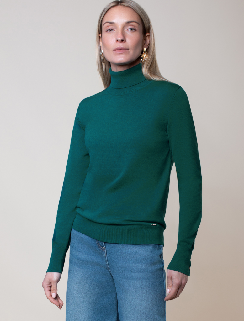 Водолазка тонкой вязки выполнена из хлопка. Лаконичная модель дополнена манжетами с золотистыми пуговицами. Изделие не сковывает движений и подходит для любой фигуры. Мягкая пряжа очень приятная к телу не колется и сохраняет тепло при этом не перегревая.