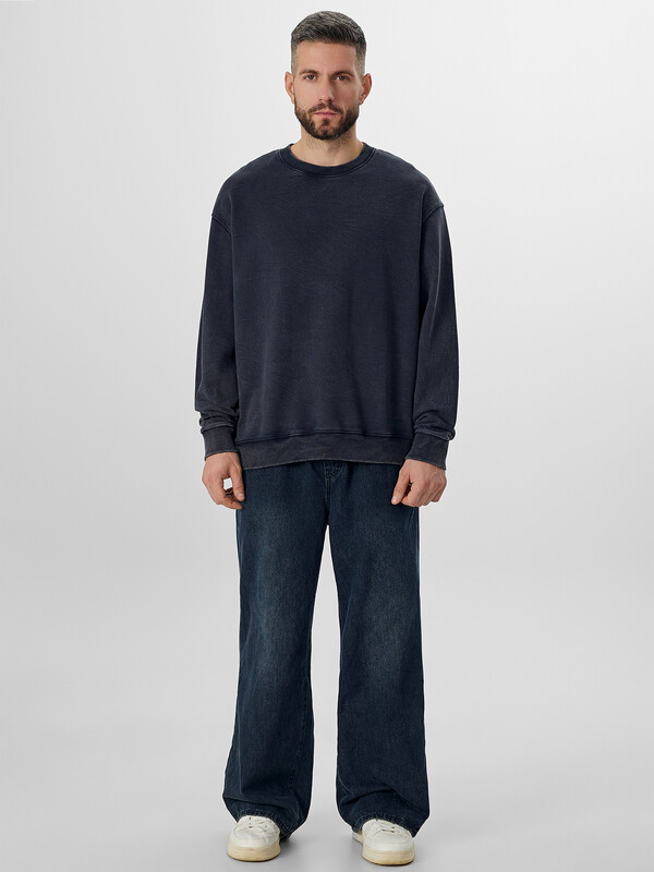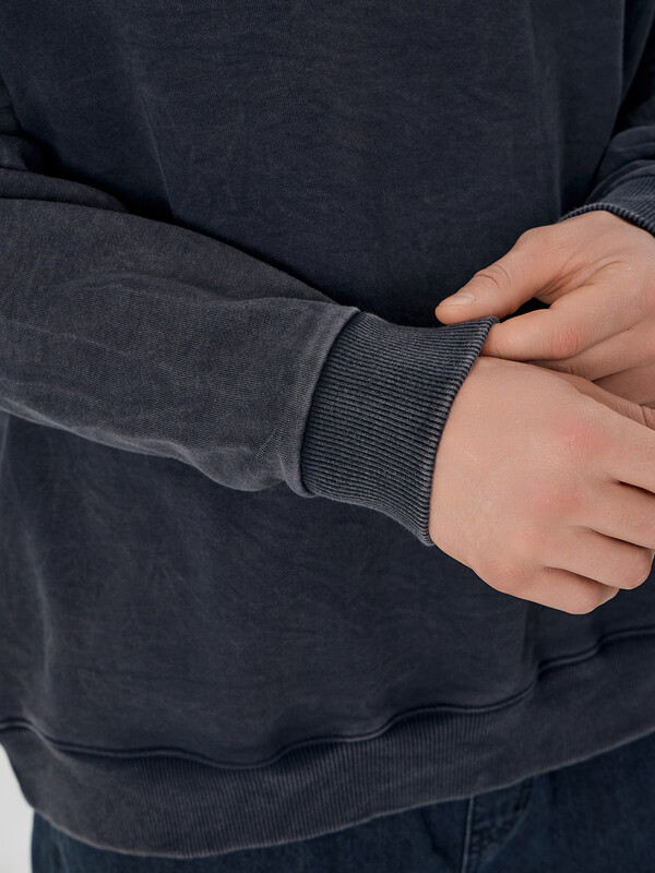 Синий свитшот с эффектом acid wash — стильный вариант для прохладной погоды. Каждая модель уникальна благодаря благородным потёртостям и мягким переходам цвета, которые создают индивидуальный дизайн.