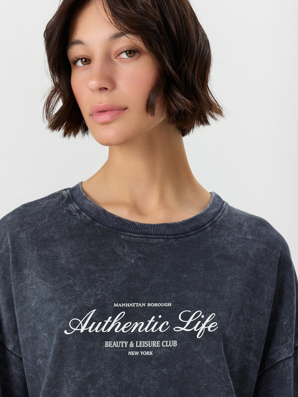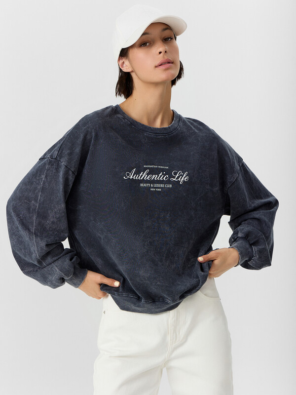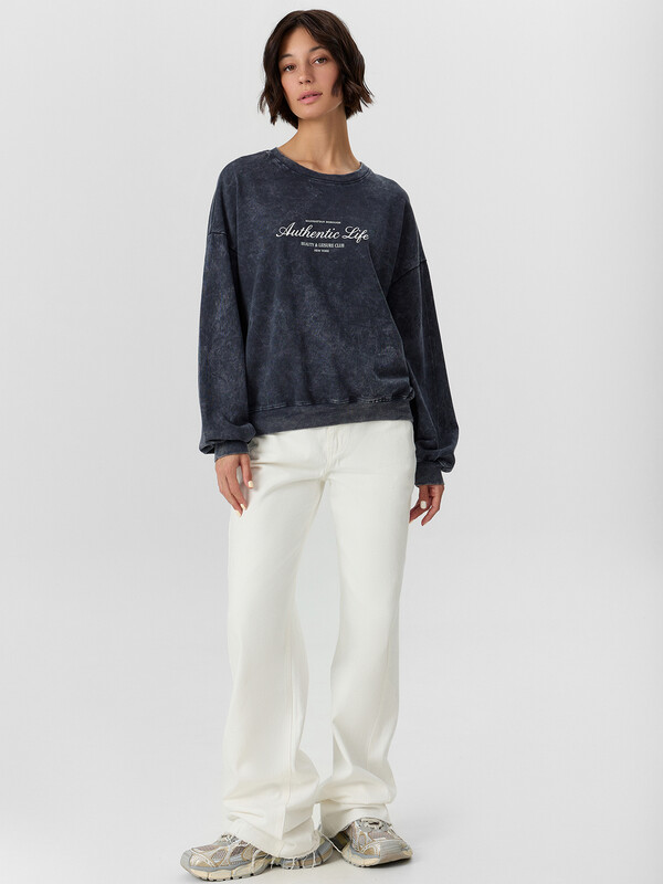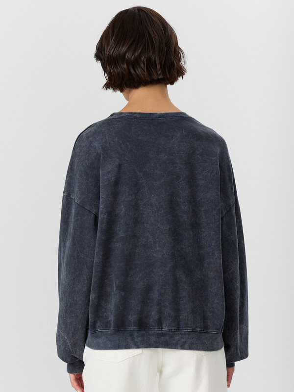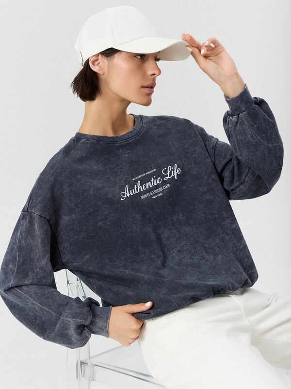 Джемпер свободного силуэта, длиной до бедер. Горловина круглая, обработана обтачкой из рибаны. Рукава втачные длинные, линия плеча спущена. По низу рукавов отрезная манжета из рибаны. По низу джемпера отрезной пояс из рибаны.