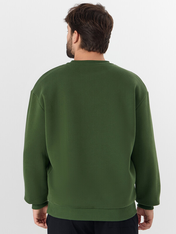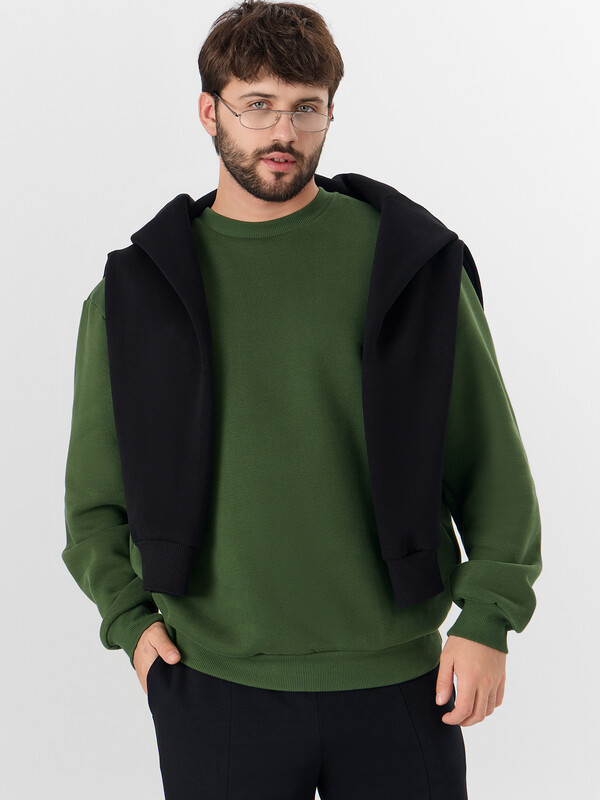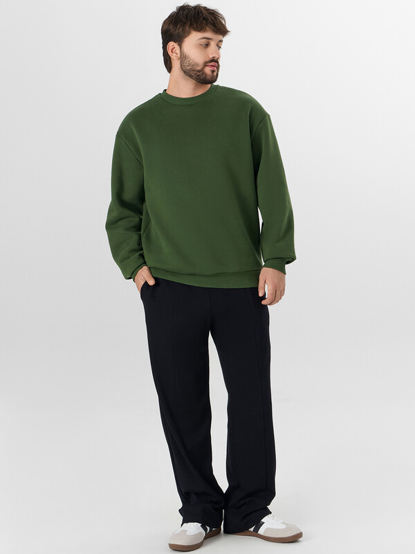 Теплый мужской свитшот из трикотажного футера с нежным подчесом. Силуэт прямой, вырез классический – круглый, не глубокий. Рукава длинные, на манжетах из рибаны. Спущенная линия плеча дарит свободу движений. Пояс, проходящий по нижнему срезу, также сделан из рибаны. Отличный свитшот для городских образов.