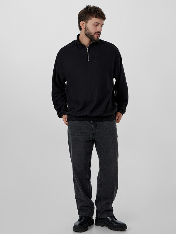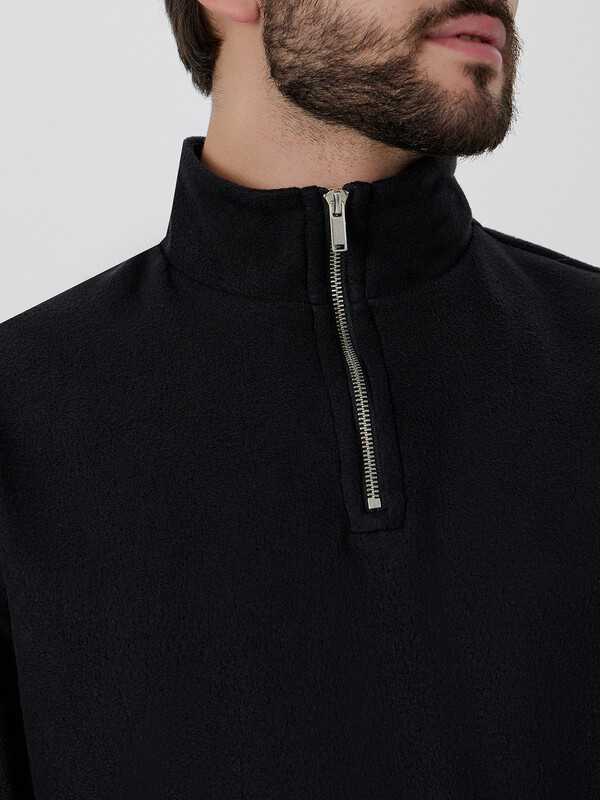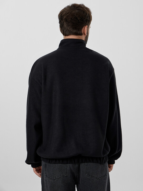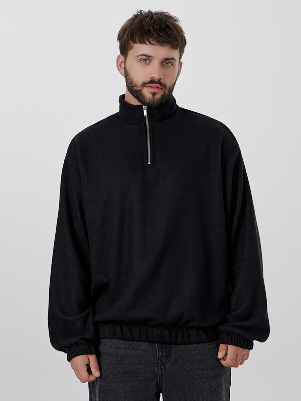 Черный мужской свитшот из мягкого флиса — идеальный выбор для прохладной погоды. Модель свободного прямого кроя со слегка спущенной линией плеча обеспечивает комфорт и свободу движений. Удобная застежка-молния по центру позволяет легко регулировать терморегуляцию.