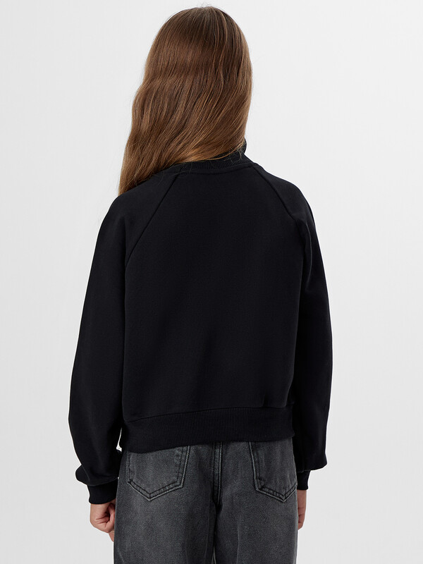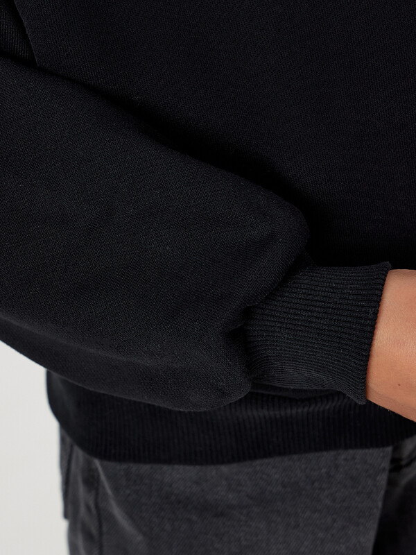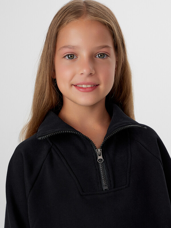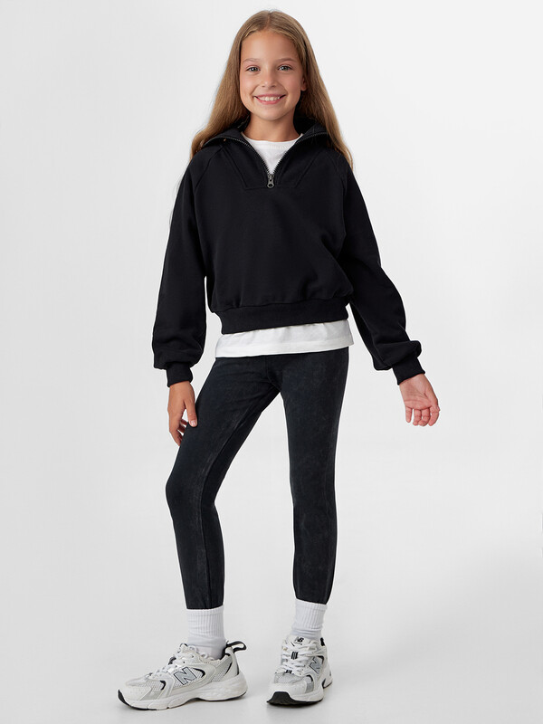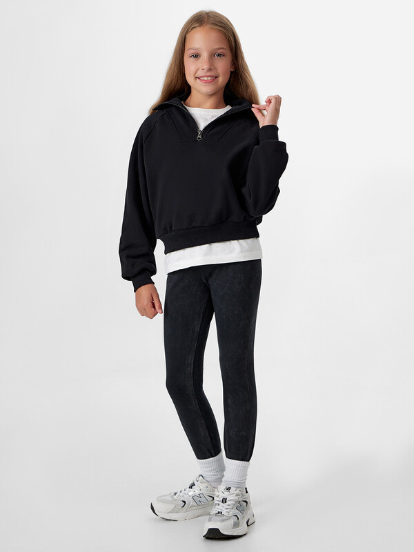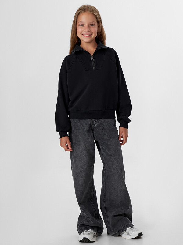 Свитшот свободного силуэта. Рукава длинные, реглан. Линия плеча спущена. Перед и спинка цельнокроенные. Горловина круглой формы с втачным воротником из рибаны. По переду изделия застежка-молния. По низу рукавов и джемпера притачены манжеты и пояс из рибаны.