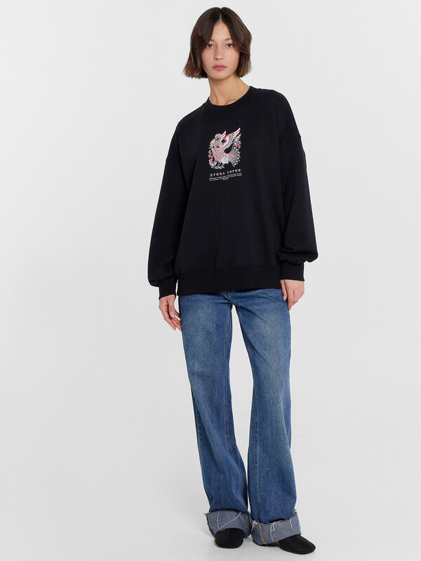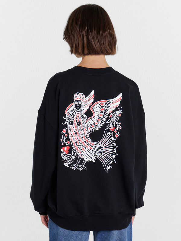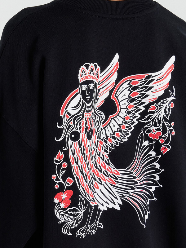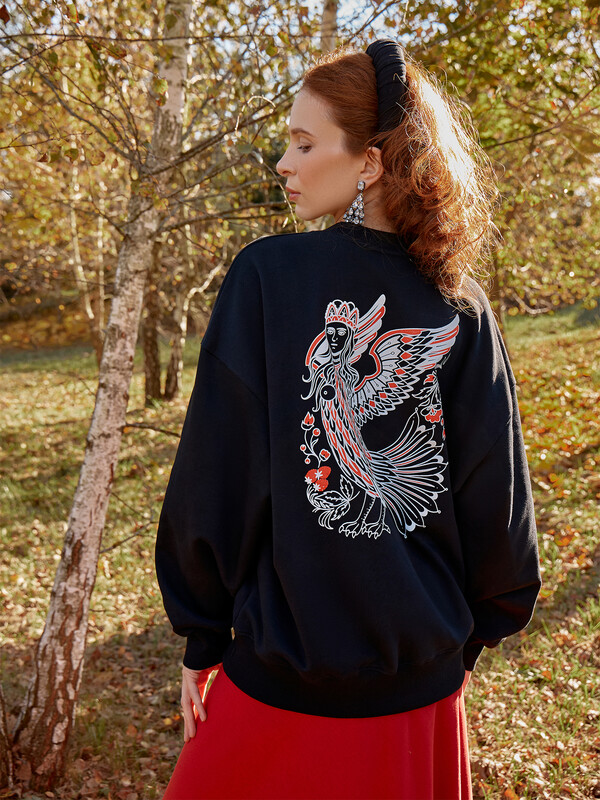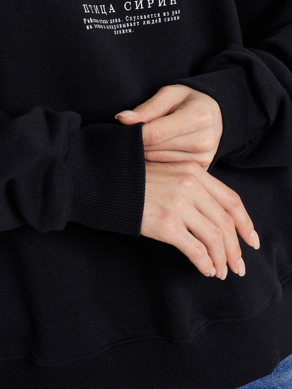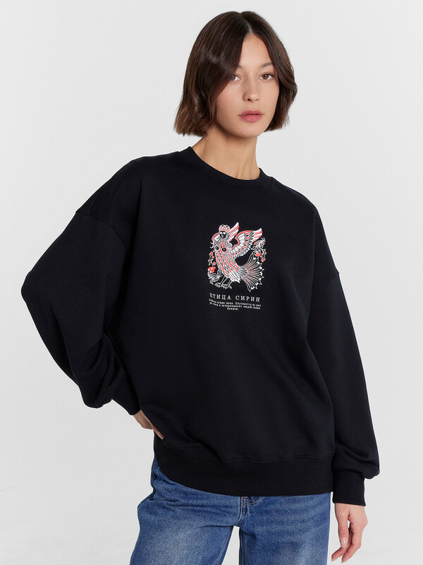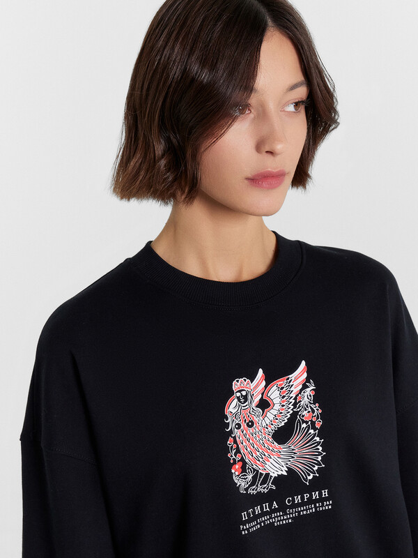 Стильный свитшот женский из футера без подчеса с принтом в виде райской птицы-девы Сирин из средневековой книжной мифологии, образ которой восходит к древнегреческим сиренам. Сирин, спускалась из рая на землю, и очаровывала людей своим пением. У изделия горловина круглой формы из рибаны. Рукава длинные с отрезными манжетами из рибаны. Линия плеча спущена, пройма углублена. Плечевые швы смещены в сторону переда. По низу джемпера - отрезной пояс из рибаны. Широкий размерный ряд. Красивая и оригинальная модель для создания лаконичных образов на каждый день. Рекомендуем!