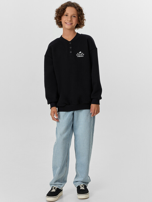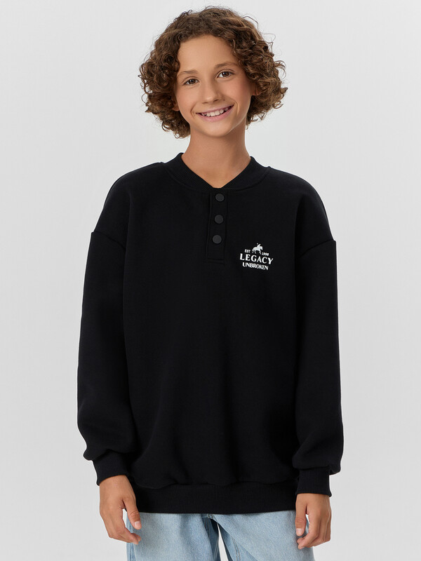 Свитшот для мальчиков свободного силуэта — идеальный выбор для активных мальчиков, которым важно чувствовать себя комфортно и выглядеть стильно. Модель выполнена из мягкого футера с подчесом, который отлично сохраняет тепло и приятен к телу, обеспечивая уют в прохладную погоду. Спущенная линия плеча и длинные рукава создают расслабленный, стильный образ, а воротник-стойка из рибаны добавляет оригинальности. Застежка на кнопки делает свитшот удобным в использовании, позволяя легко надевать и снимать изделие. Манжеты и пояс из рибаны надежно фиксируют посадку, не сдавливая и не ограничивая движения. Этот свитшот — практичная и стильная вещь, которая подойдет для школы, прогулок и отдыха. Он легко сочетается с джинсами, спортивными брюками или шортами, оставаясь актуальным в любом образе.