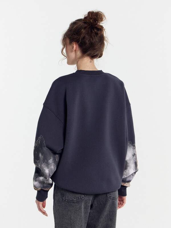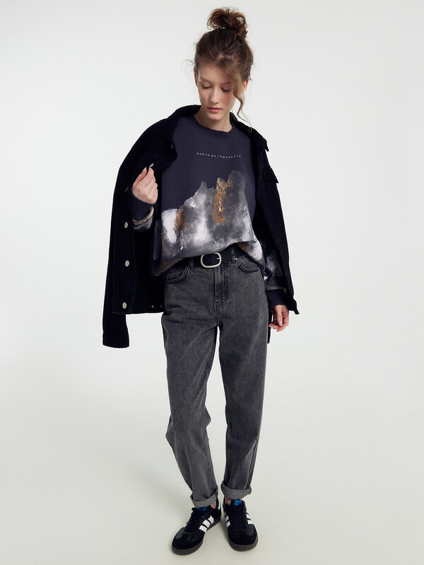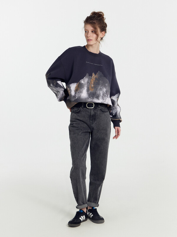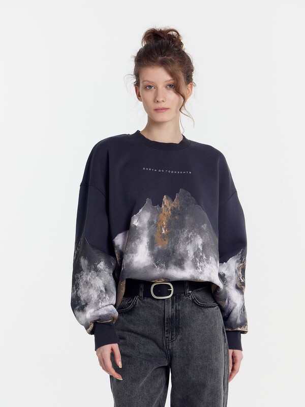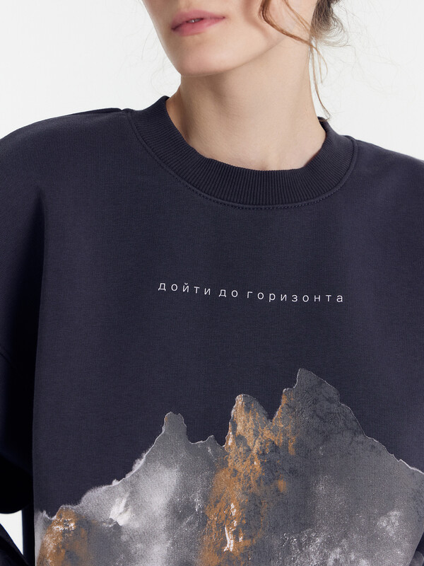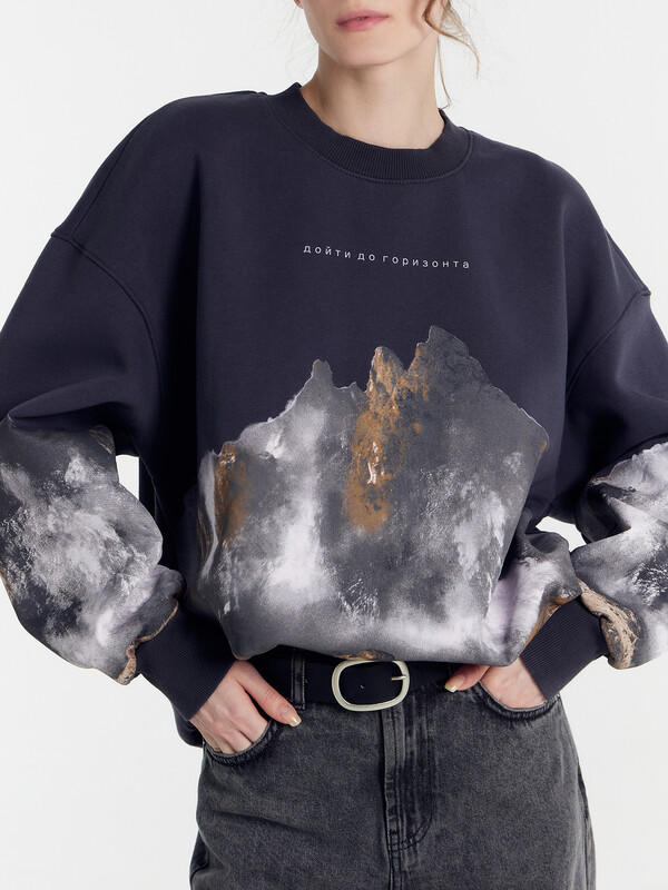 Стильный свитшот женский из коллекции "Нетронутая красота". Выполнен из футера с теплым подчесом. Модель с принтом в виде гор и надписи "Дойти до горизонта". Модель силуэта оверсайз. Горловина округлой формы из рибаны. Рукава втачные длинные с отрезными манжетами из рибаны. Линия плеча спущена, пройма углублена. Плечевые швы смещены в сторону переда. По низу джемпера - отрезной пояс из рибаны. Широкий размерный ряд. Красивая и оригинальная модель для создания лаконичных образов на каждый день. Рекомендуем!
