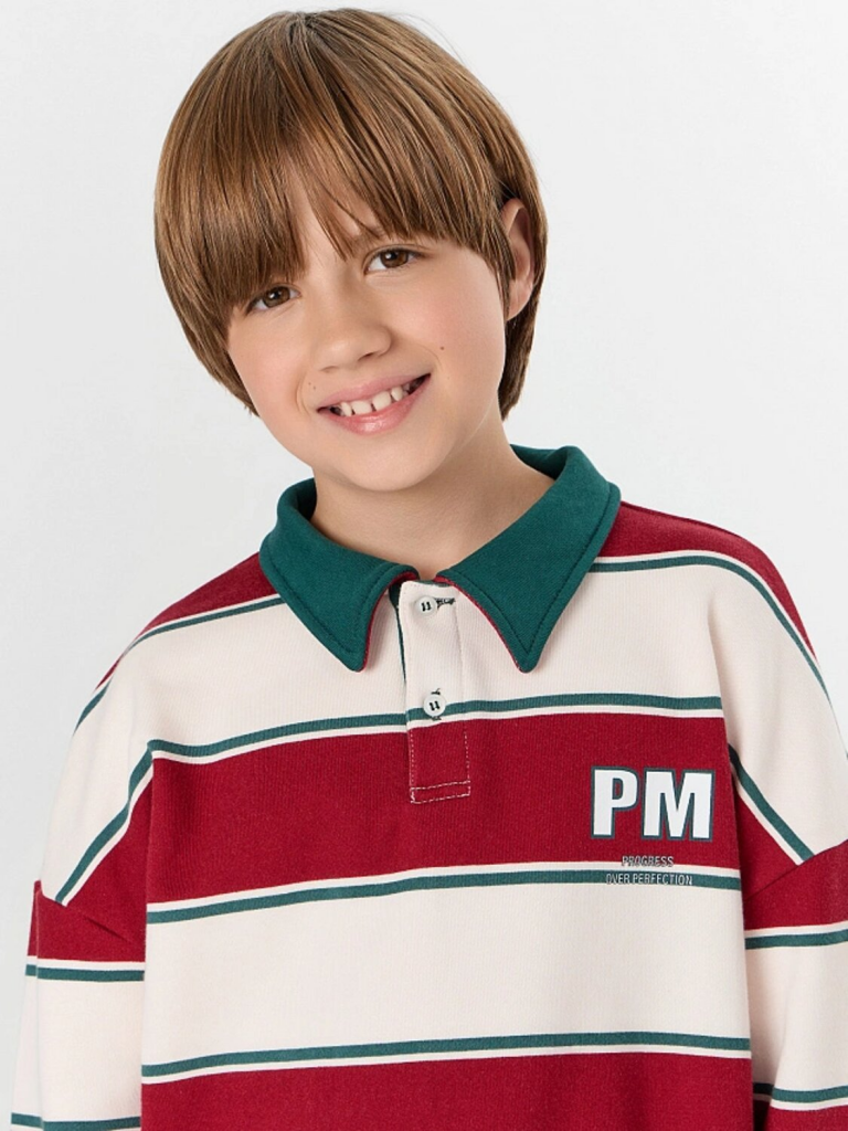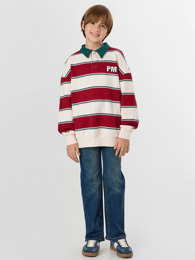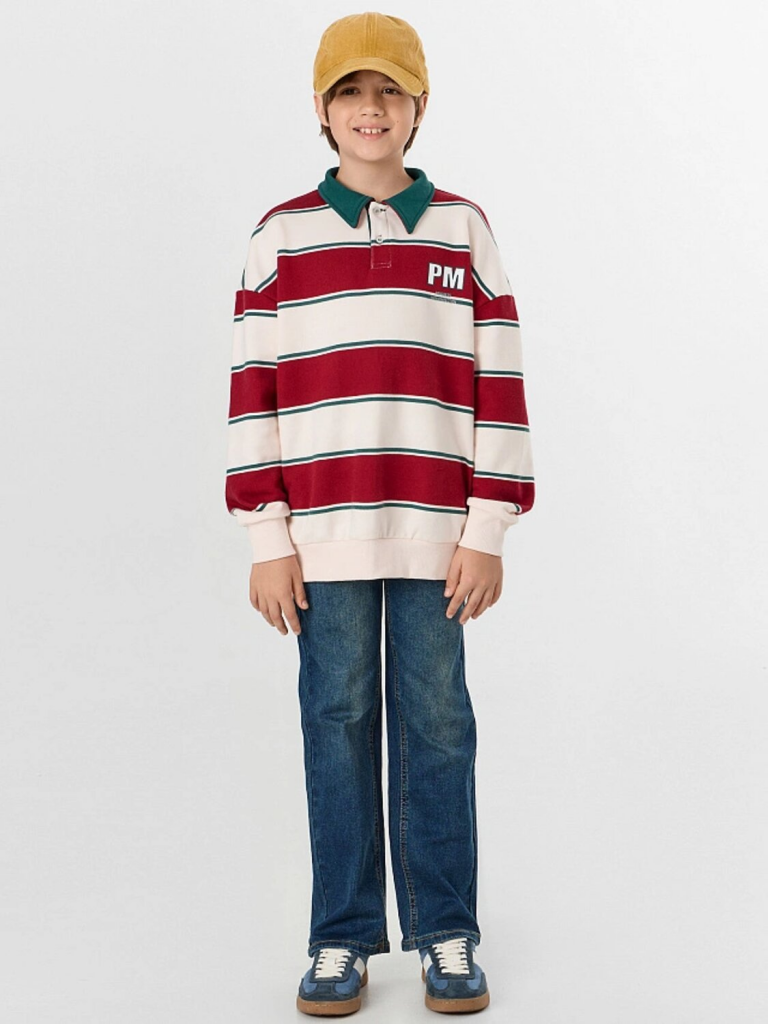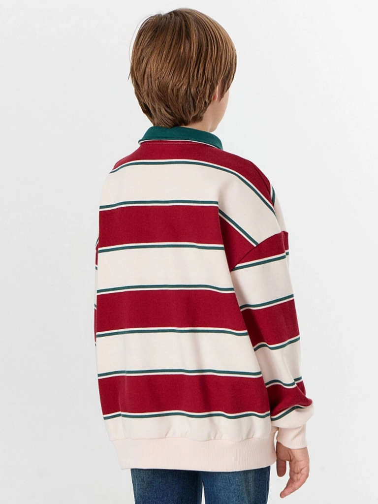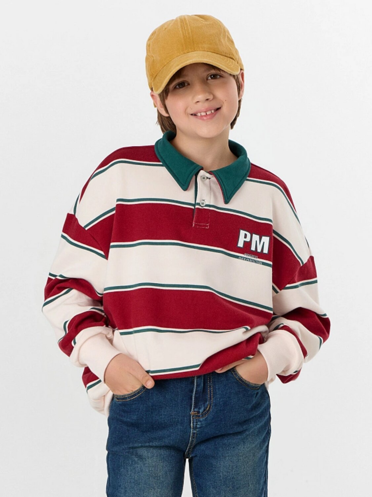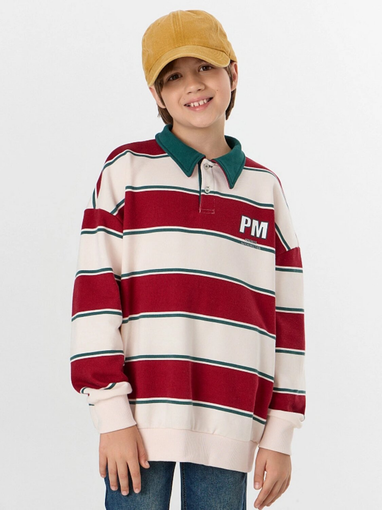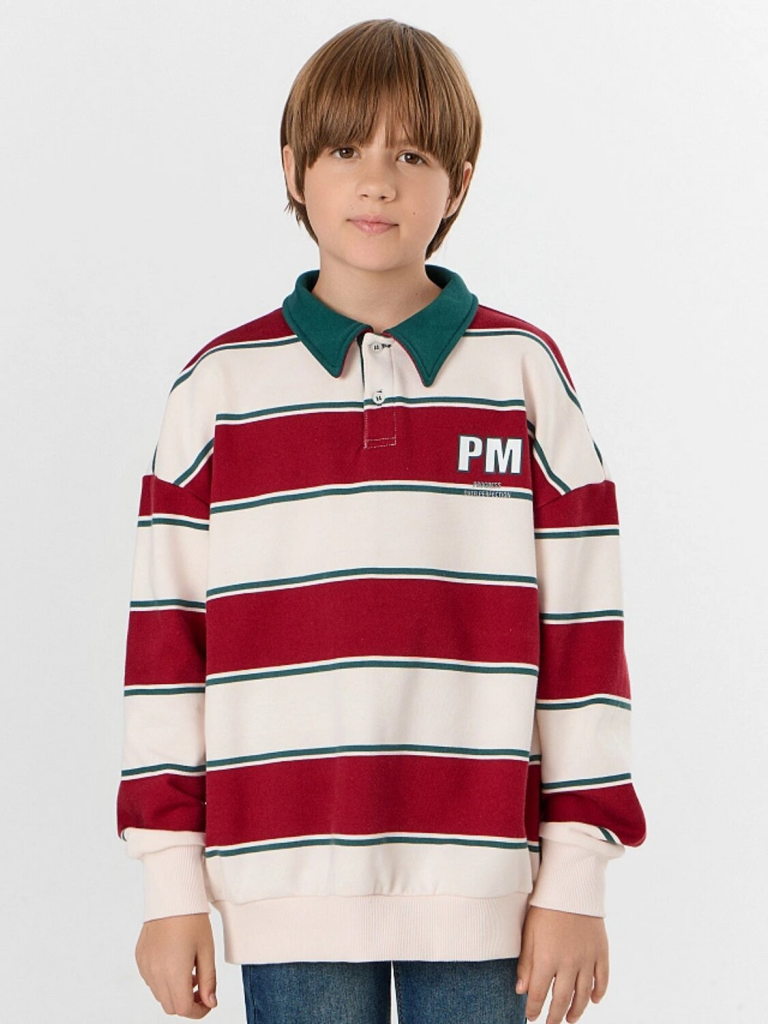 Свитшот для мальчика — это стильная и комфортная модель для повседневной носки. Свободный силуэт со спущенным плечом и длинными рукавами обеспечивает полную свободу движений, а отрезные манжеты из рибаны мягко фиксируют запястья, сохраняя тепло. Округлая горловина с рубашечным воротником и застежкой на пуговицы добавляет образу аккуратности, напоминая классический поло, но с уютом свитшота.