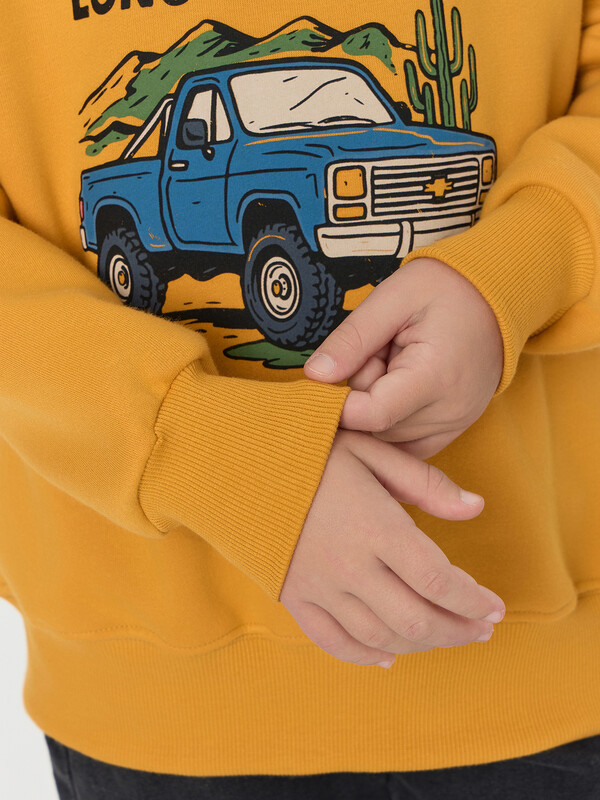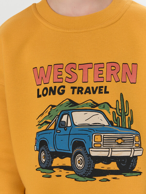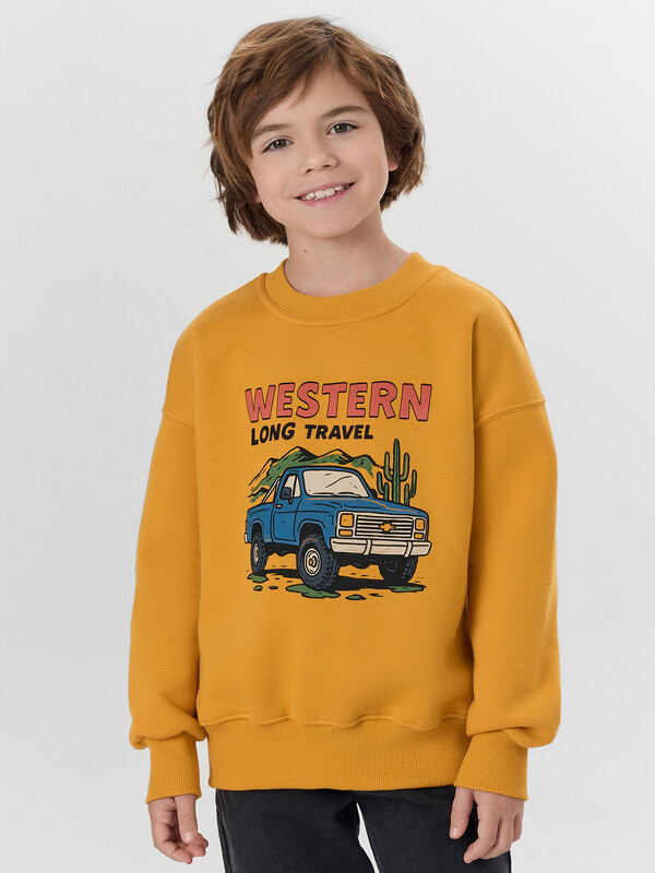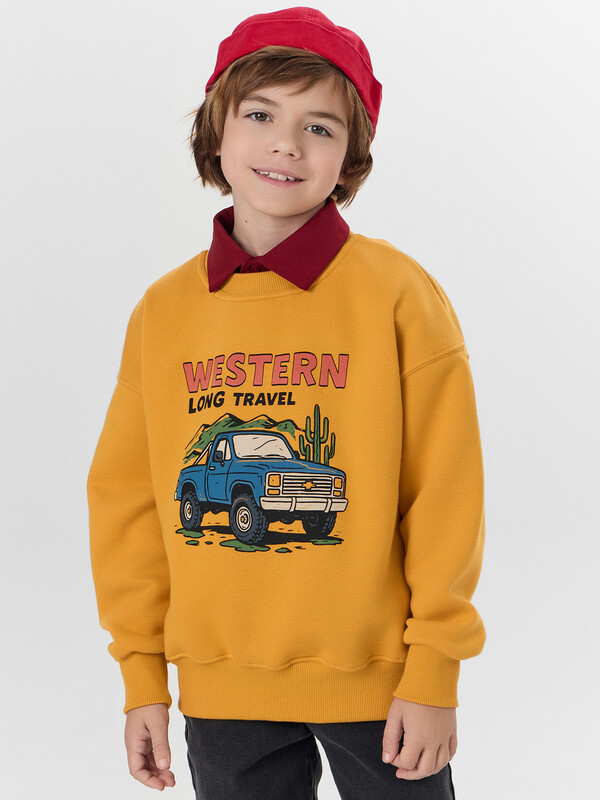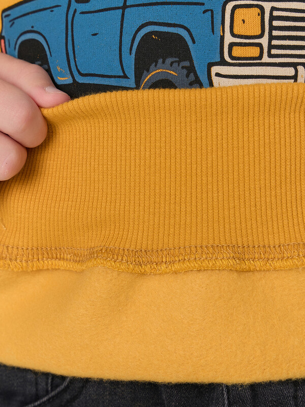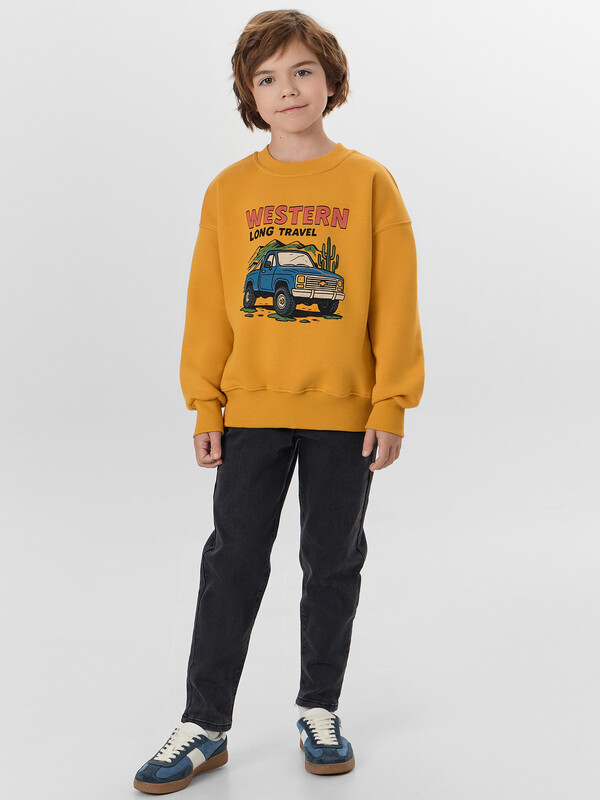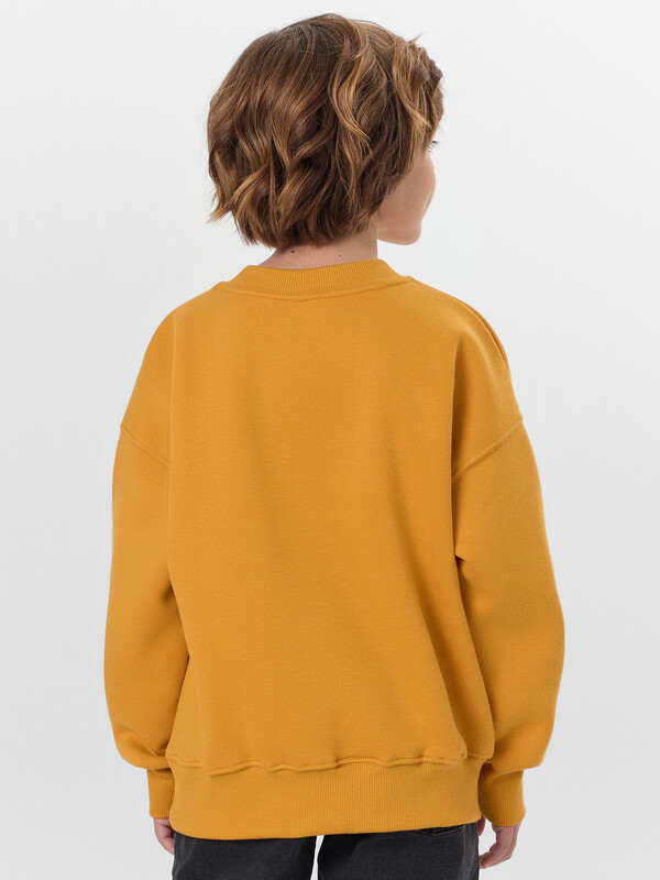 Свитшот свободного силуэта. Рукава длинные, втачные. Линия плеча спущена. Перед и спинка цельнокроенные. Горловина круглой формы. В горловину втачен воротник-стойка из рибаны. По переду изделия застежка на кнопки d=15 мм. По низу рукавов и джемпера притачены манжеты и пояс из рибаны.
